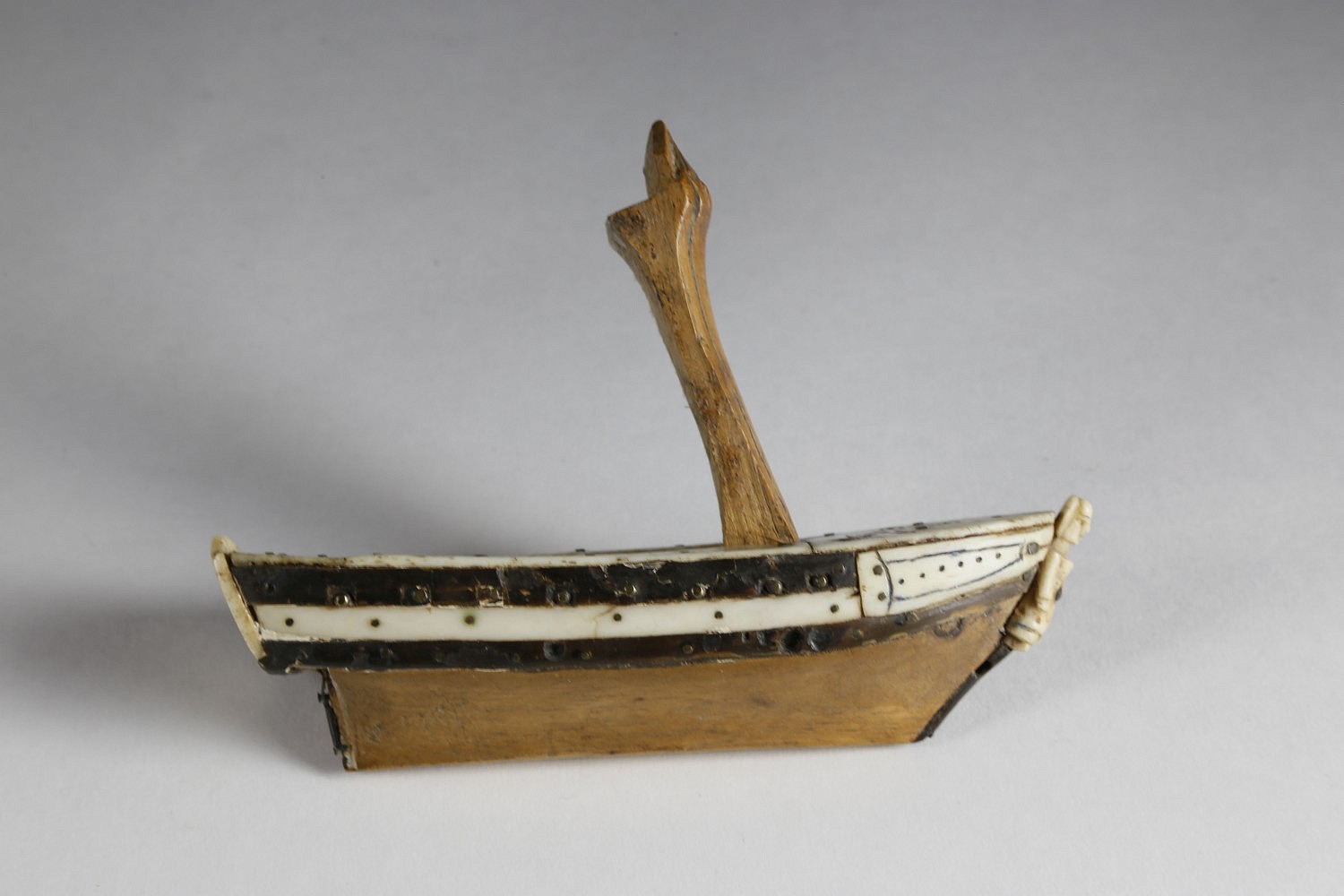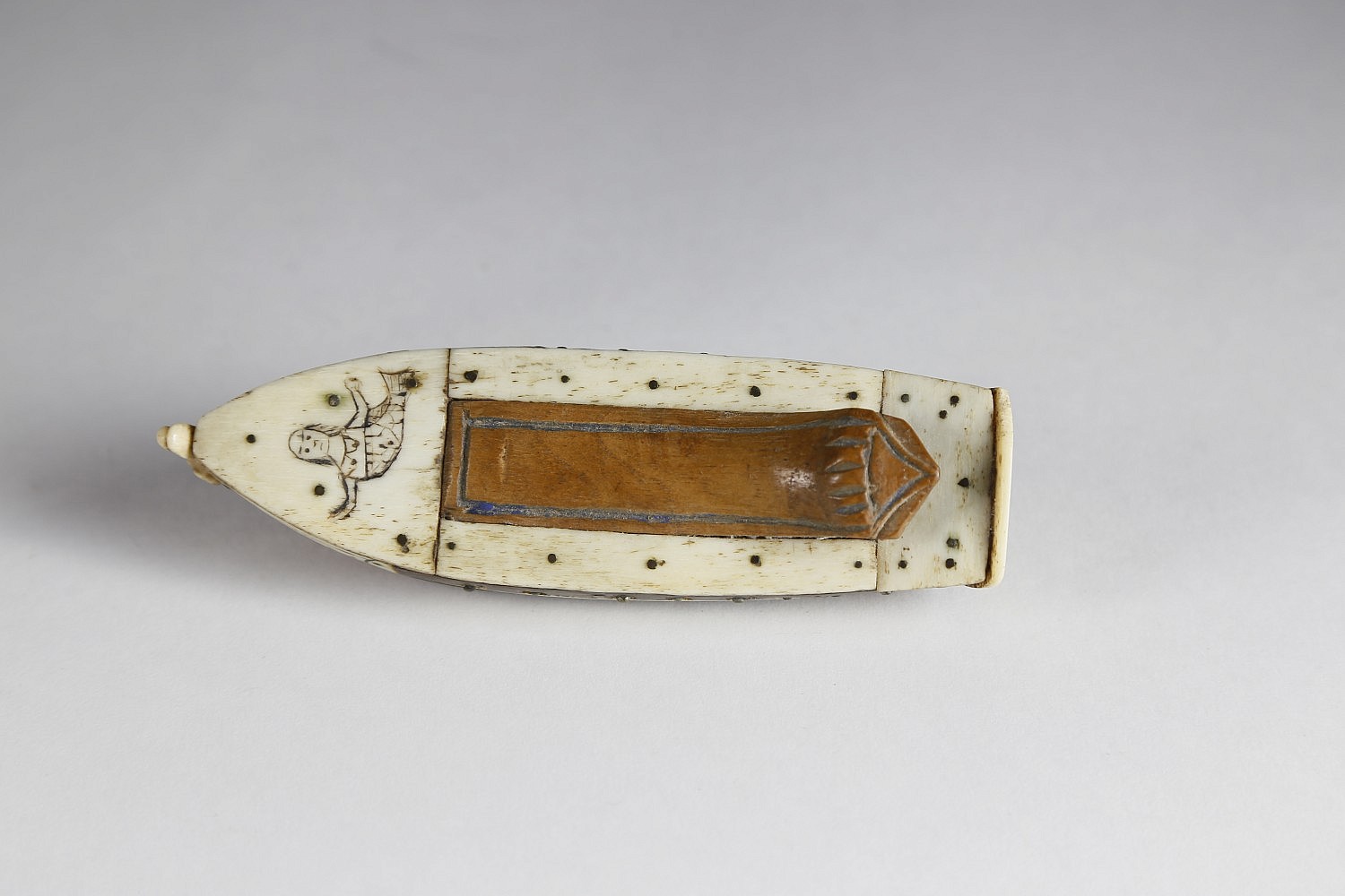 Whaleman Carved Ship Hull Snuff Box, circa 1850, wood hull with inlaid baleen gun ports, 16 brass tackhead cannons, whalebone deck with mermaid scrimshaw and hinged wood box top, carved bone figurehead and scrimshawed stern.
