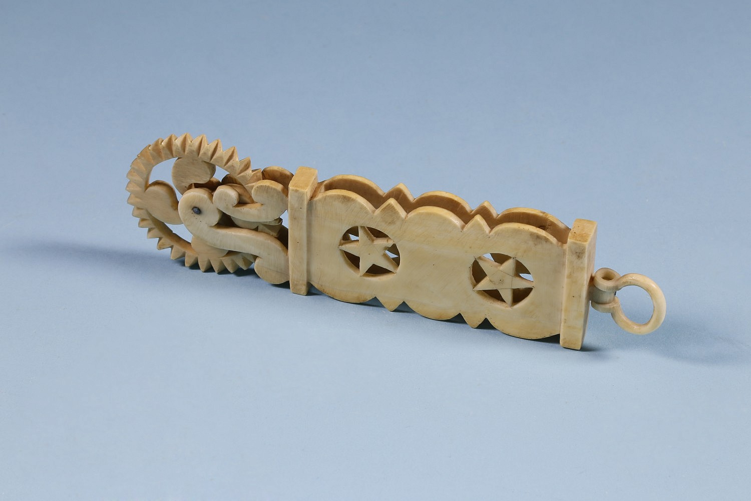 Whaleman Made Whale Ivory Pie Crimper, circa 1840-1850, the hollowed out handle carved with 4 open stars, diamond and scrolled sides, double scroll spokes pinned to a 4-spoke open zigzag wheel, the opposing end with a hinged hanging loop.