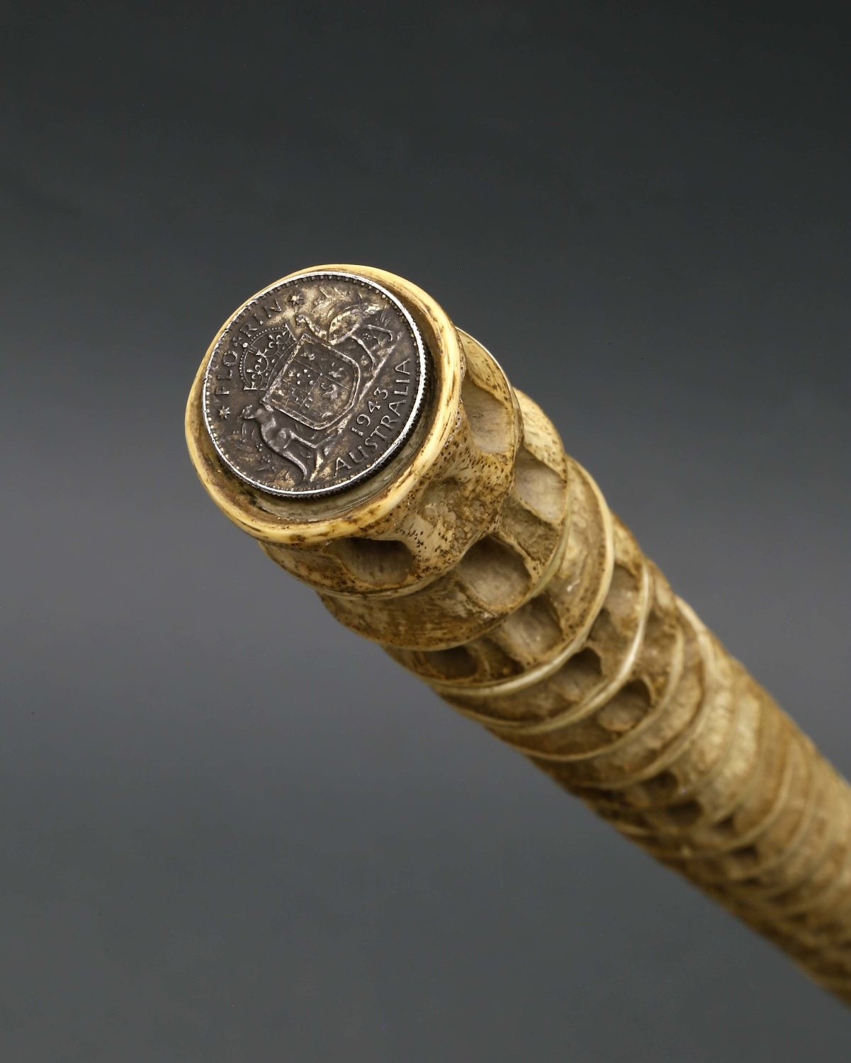 Lot 347: Shark Vertebrae Walking Stick, capped with a 1943 Australian coin, 49 graduating vertebrae ending with an applied high-caliber bullet ferrule.