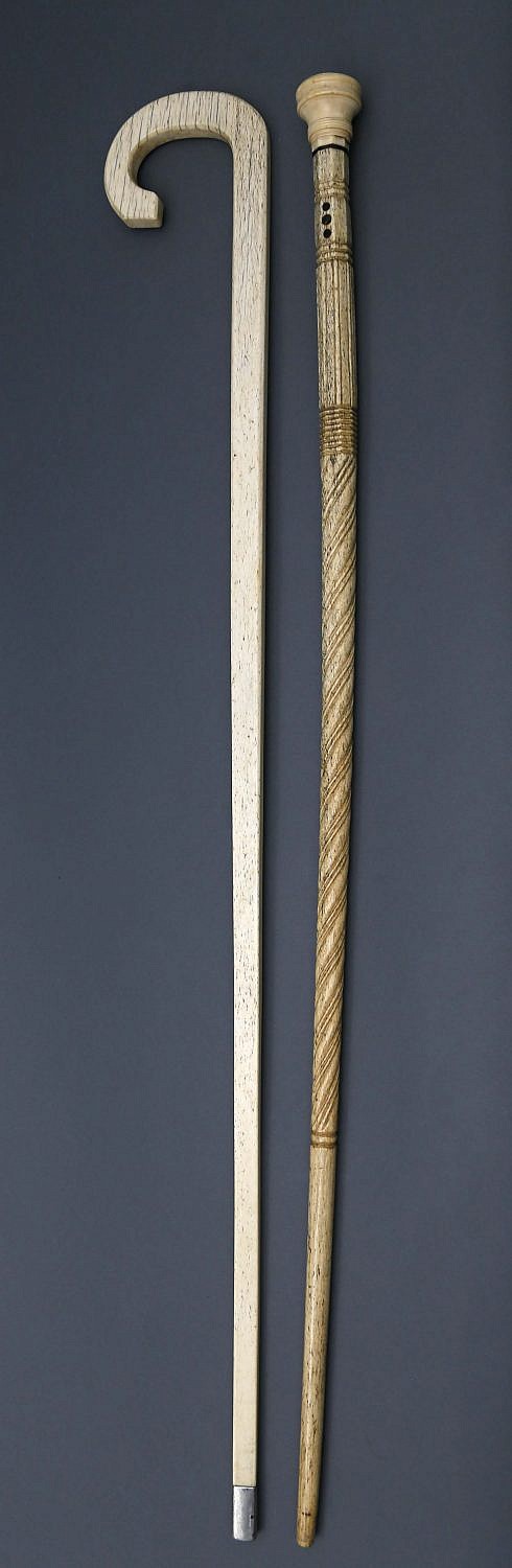 Whaler Carved Whale Ivory and Whalebone Walking Stick, circa 1850, flat top knob grip with fine turnings with a baleen spacer on a whalebone shaft having a double paneled octagonal section with conforming rings and eyelet between baleen dots, above a reeded section above 8 stacked octagonal rings, above a long section of double worm-line rope ending in a plain taper.