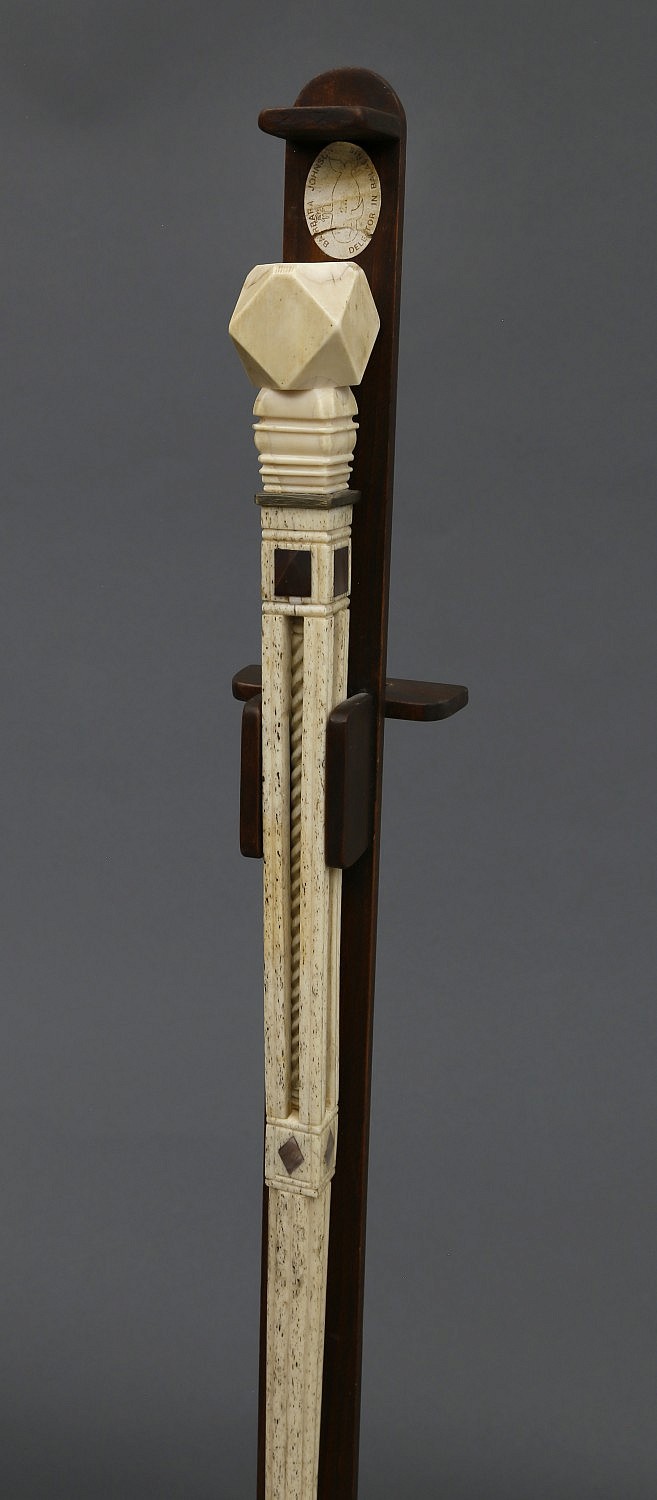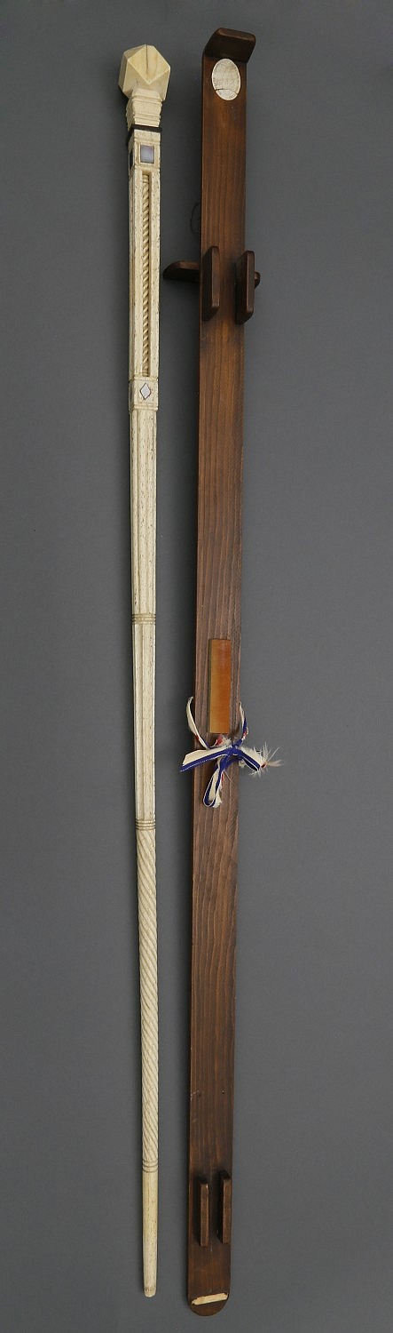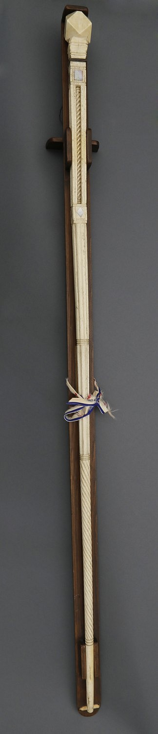 Whaler Made Whale Ivory, Whalebone, Mother-of-Pearl, Abalone and Baleen Walking Stick, circa 1860-1870, a robust and shapely polyhedron grip and square post carved from a single piece of ivory on a baleen spacer conforming to a square section of bone with four-reeded columns openwork and a twisted rod interior, flanked by square blocks inlaid with mother of pearl and abalone squares and diamonds, above a reeded section and 3-thin wafers flanking a fluted section, above a twist carving ending in a long ferrule. A custom pine wall mount with Barbara Johnson Delector in Balaenis printed label.