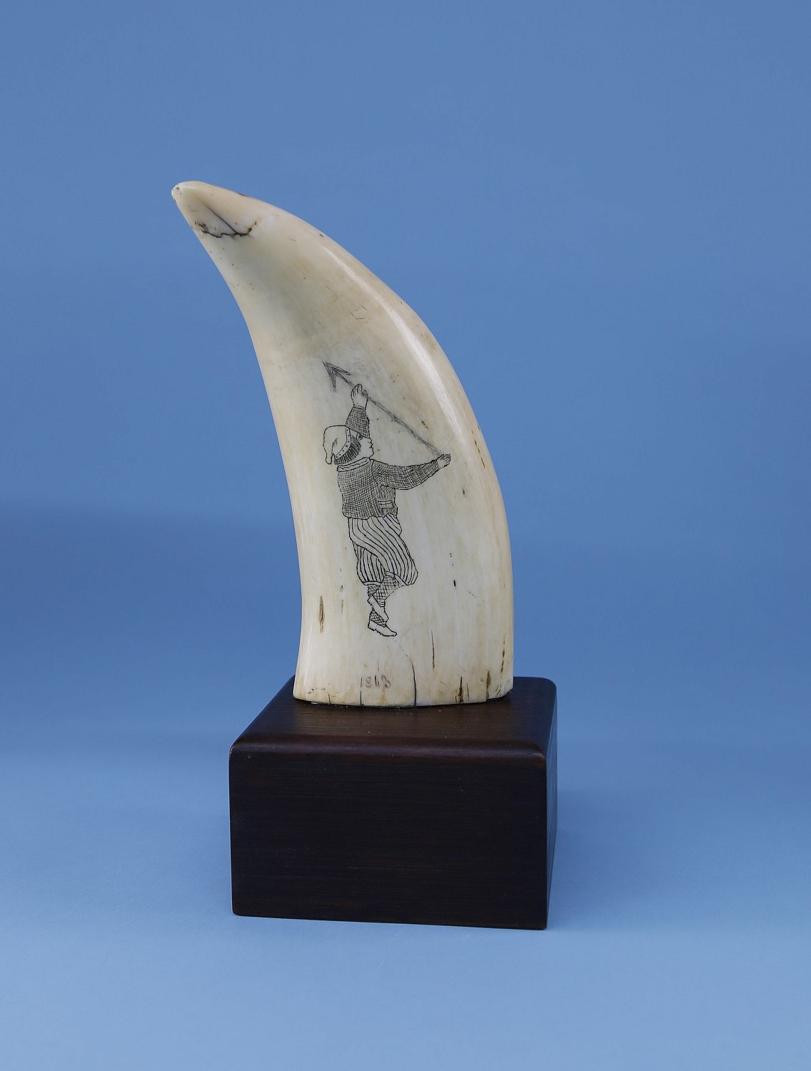 Whaler Scrimshawed Sperm Whale Tooth, mid 19th century, depicting a sailor at the top of the mast flying a whale flag and pointing in the direction of the whales. The reverse with a fancy dressed young boy holding a double fluke harpoon (of a later date) above the date 1843, on a mahogany block.