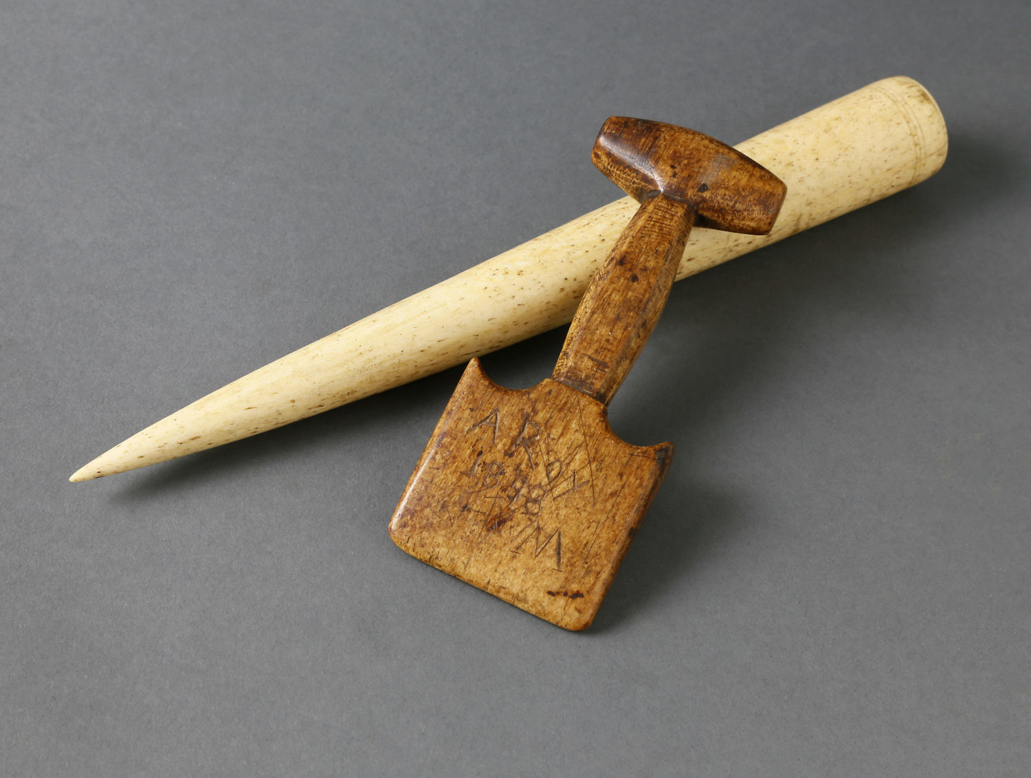 Lot 349:Whaler Carved Whalebone Seam Rub, circa 1840-50, with later engraving “A. Ray 1898”, carved from a single piece of bone with a T-grip on a shaped octagonal stem to a finger fitted notched wedge, engraved and diamond carving on reverse.