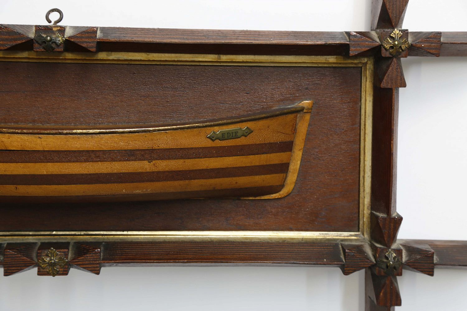 Wonderfully Framed Half-hull Model of “Edie” Consign Now DeptMaritime ArtsSize14 in. x 28 ¾ in. Wonderfully Framed Half-hull Model of “Edie”, circa 1870, with alternating light and dark wood 6-lift stacked hull construction within a deep carved figured pine Eastlake style frame with crosses at the corners and gilt liner. 14 in. x 28 ¾ in. Please note that this auction has ended. Click here for an overview of this auction.