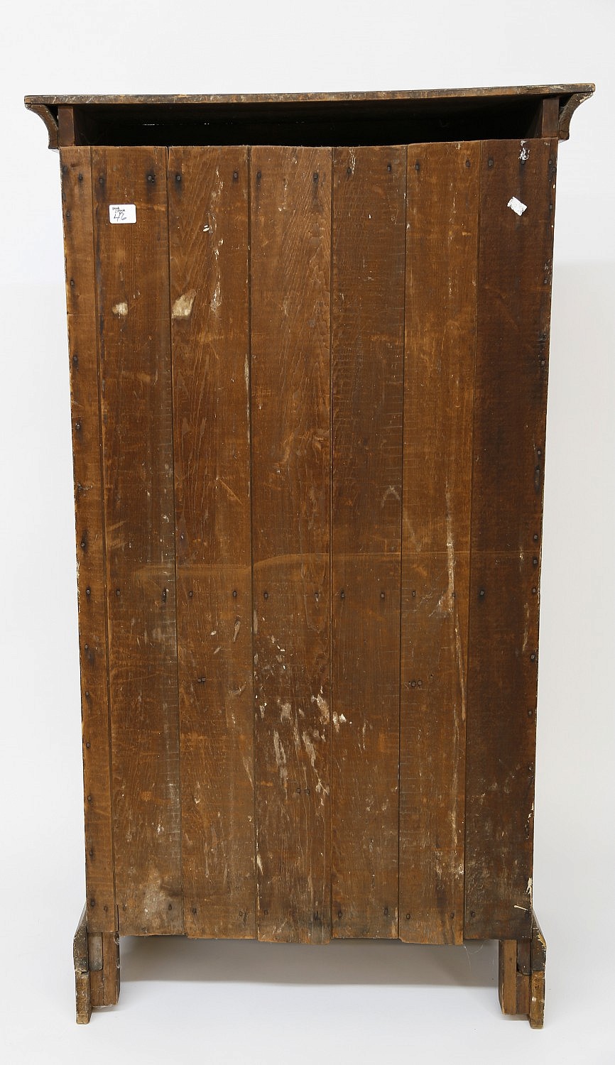 American Diminutive Youth Cupboard, late 18th century, two doors above three over two drawers in original mustard paint, the interior cupboard with pigeon holes above shelves.