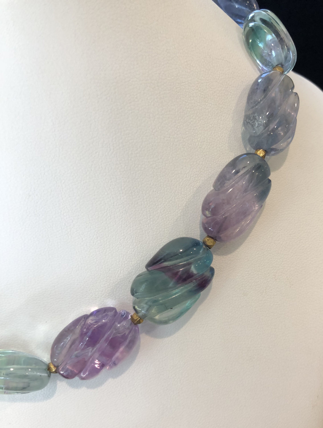 16mm x 24mm Carved Fluorite Bead Necklace Consign Now DeptJewelry 16mm x 24mm Carved Fluorite Bead Necklace with sterling vermeil clasp and beads. Please note that this auction has ended. Click here for an overview of this auction.