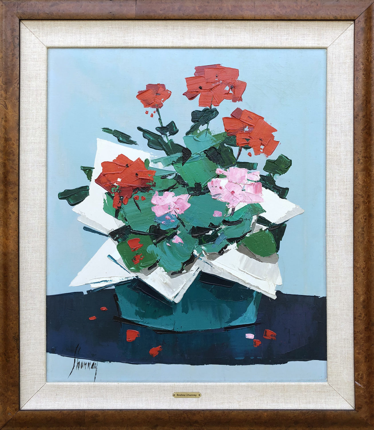 Andrew Shunney Oil on Canvas “Floral Still Life” Consign Now ArtistAndrew Shunney (1916-1978)Click here for artist bioDeptFine ArtsSize24 in. x 20 in. 30 ½ in. x 26 ½ in. Andrew Shunney (1916-1978) Oil on Canvas “Floral Still Life”, signed lower left Shunney. 24 in. x 20 in. 30 ½ in. x 26 ½ in. Please note that this auction has ended. Click here for an overview of this auction.