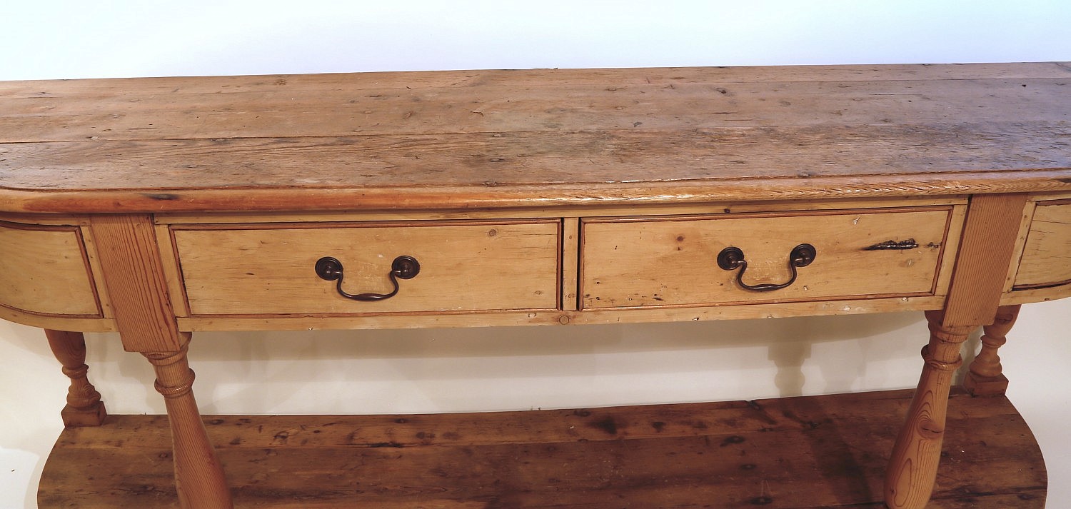 Demi-Lune Pine Sideboard Consign Now DeptCollections, Furniture/Decorative ArtsSizeHeight 34 ½ in. Width 85 in. and Depth 20 in. 19th Century English Demi-Lune Pine Sideboard with four drawers and lower shelf turned and four turn baluster columns, brass post and bale hardware Height 34 ½ in. Width 85 in. and Depth 20 in. Please note that this auction has ended. Click here for an overview of this auction.