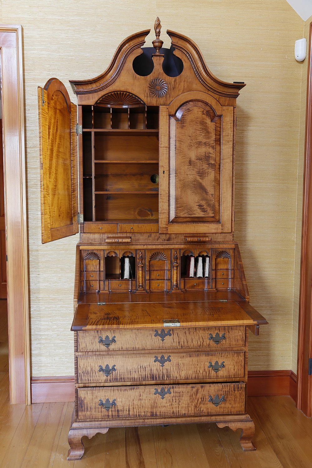 Douglas Partridge Dimes Chippendale Style Tiger Maple Secretary Bookcase