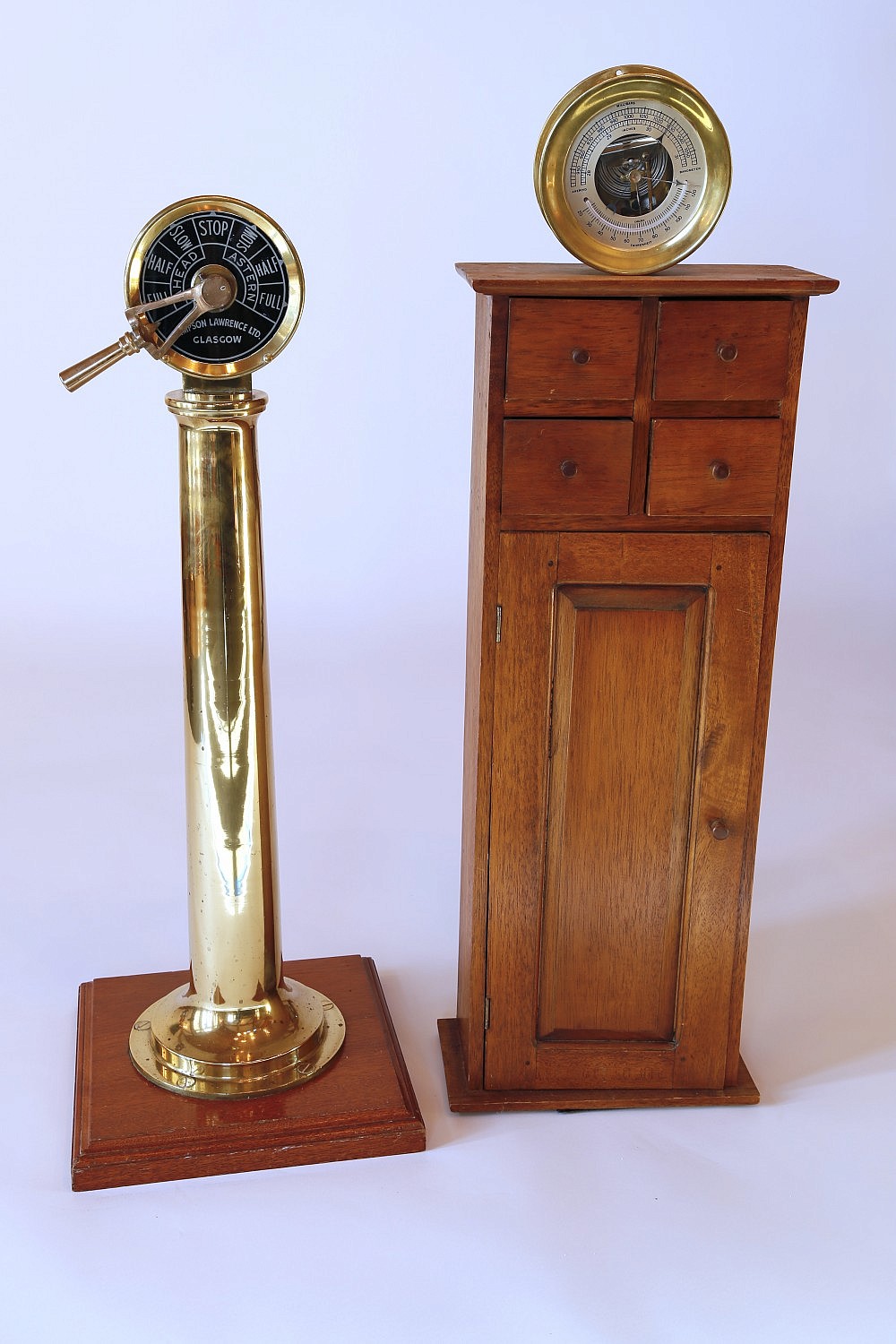 Ship’s Brass Telegraph, Chelsea Brass Barometer and Petite Narrow Pine Cabinet Consign Now DeptCollections, Maritime ArtsSizeHeight 43 ¼ in., Diameter 8 in., and Height 39 in. Ship’s Brass Telegraph by Simpson Lawrence LTD., Glasgow, Scotland Height 43 ¼ in. Chelsea Brass Barometer. Diameter Approximately 8 in. Petite Narrow Pine Cabinet, four drawers over single door Height approximately 39 in. Please note that this auction has ended. Click here for an overview of this auction.