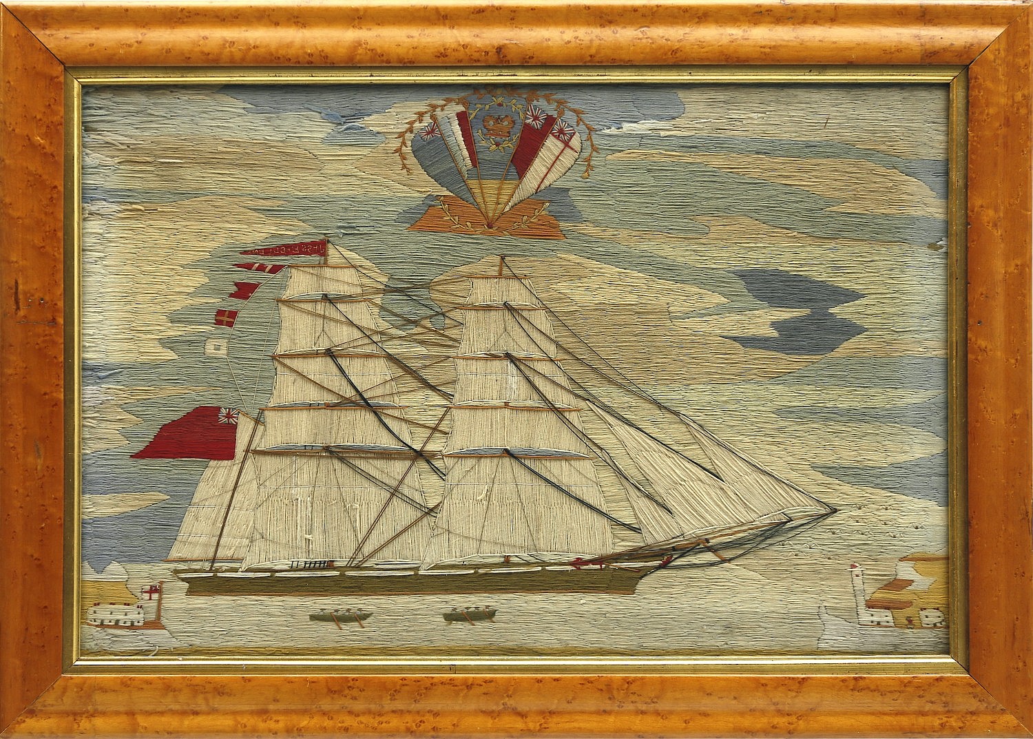 British Sailor’s Woolwork of the Brig Jesse Ellen, circa 1870, with pennant flying, the merchant ship sails past a British fort on the left; lighthouse on right with a flock of 12 gulls overhead; eight sailors in two small boats destined for the fort and a colorful royal crest above in bird’s eye maple frame with gilt slip.