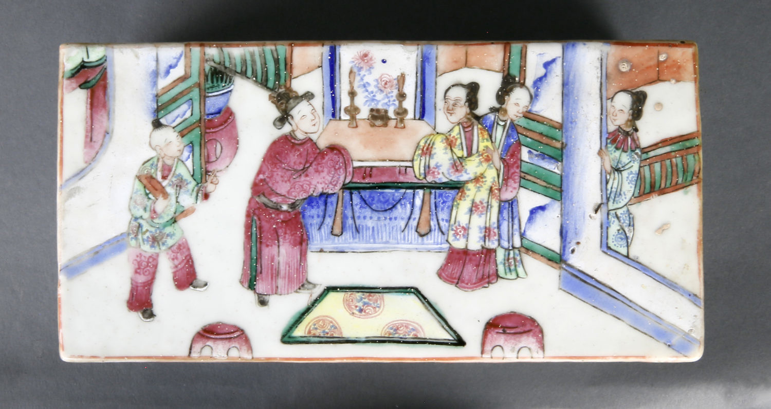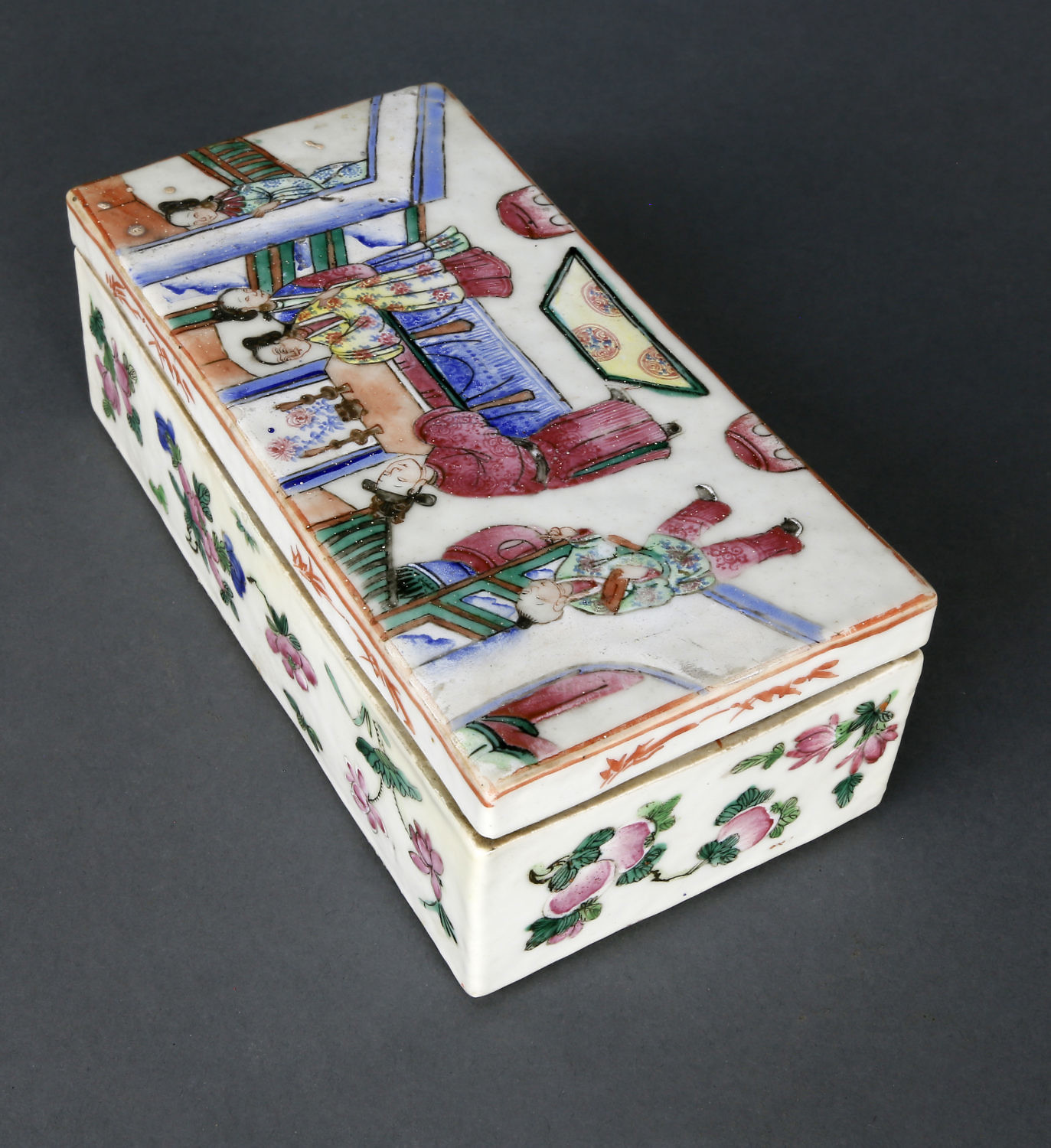 Chinese Export Rose Mandarin Covered Box Consign Now DeptAsian Arts/China Trade, CollectionsSizeHeight 2 ½ in. Width 7 ¼ in. Depth 3 ¾ in. Chinese Export Rose Mandarin Covered Box, early 19th century, with floral decoration, figures, and interior scene. Interior with dual compartments. Height 2 ½ in. Width 7 ¼ in. Depth 3 ¾ in. Please note that this auction has ended. Click here for an overview of this auction.