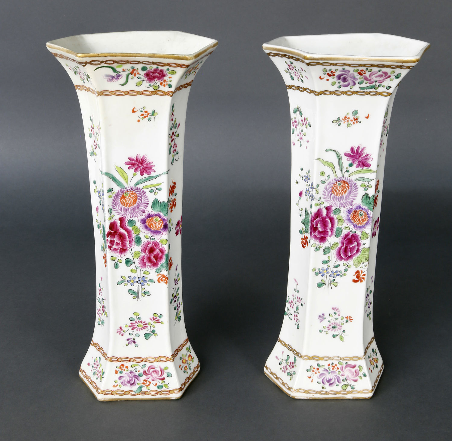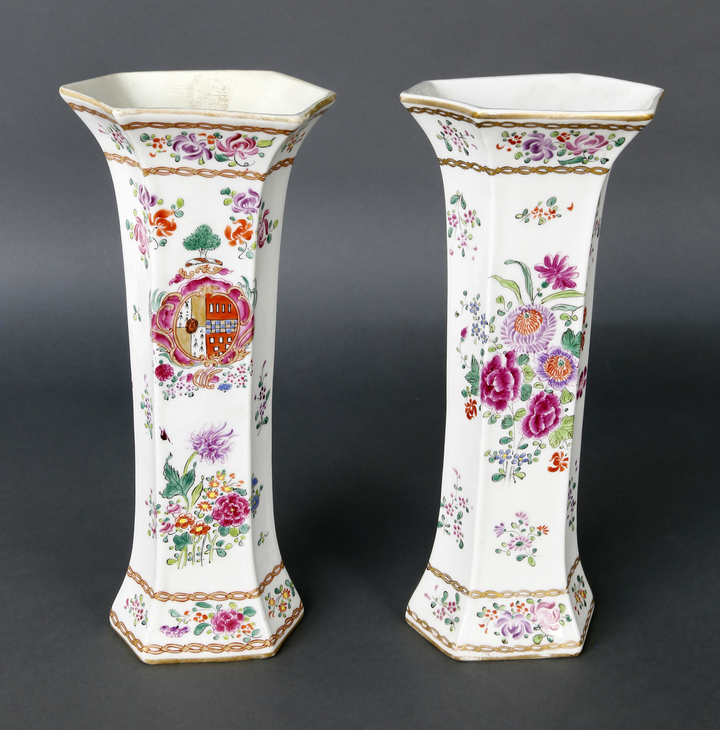 Pair of Chinese Export Armorial Coat of Arms and Floral Decorated Hexagonal Sampson Style Vases Consign Now DeptCeramics & Glass, Furniture/Decorative ArtsSizeHeight 10 ¾ in. Width 4 ¾ in. Diameter 4 in. Pair of Chinese Export Armorial Coat of Arms and Floral Decorated Hexagonal Sampson Style Vases, 19th century, with manufacturers markings on base. (Restorations to one) Height 10 ¾ in. Width 4 ¾ in. Diameter 4 in. Please note that this auction has ended. Click here for an overview of this auction.