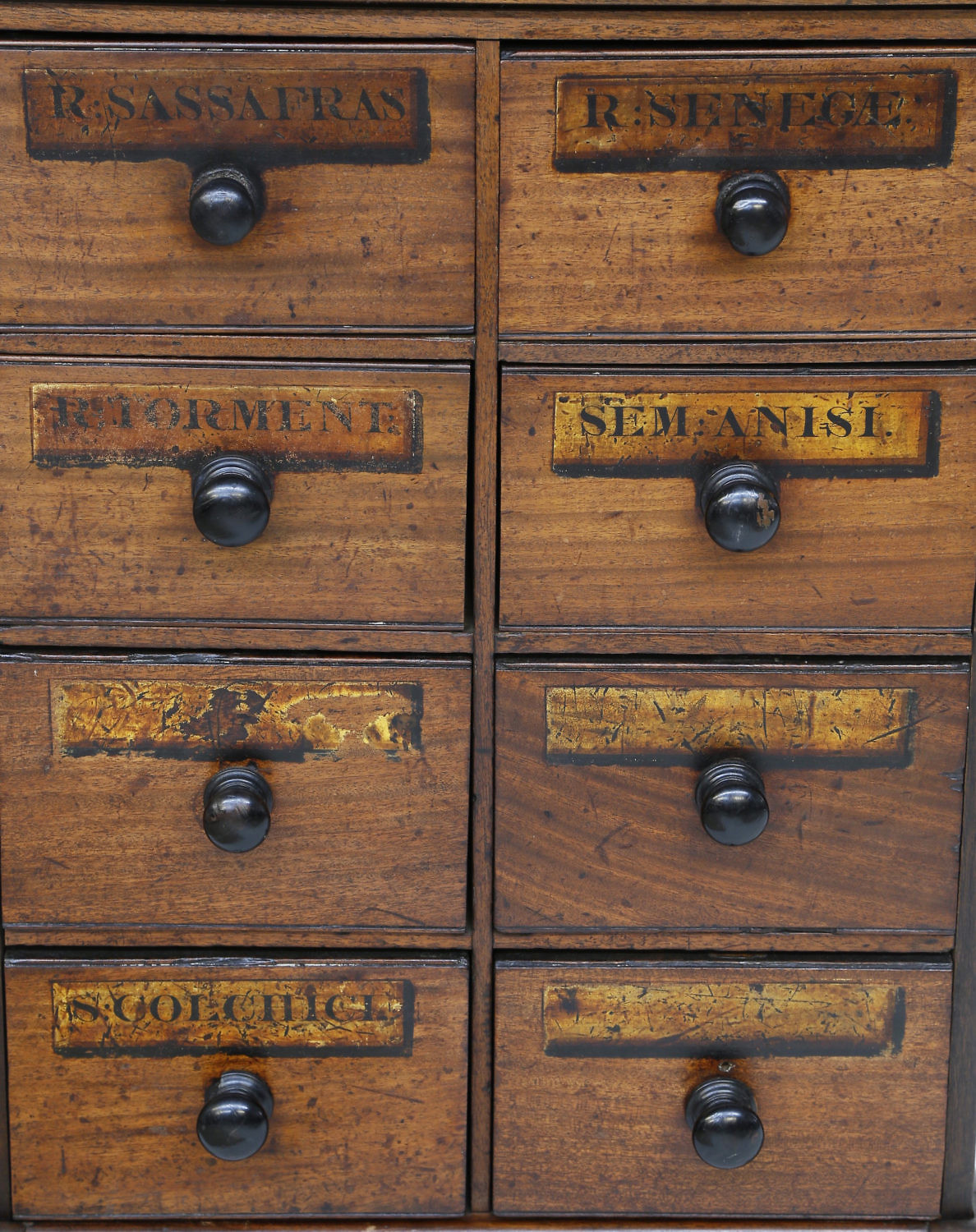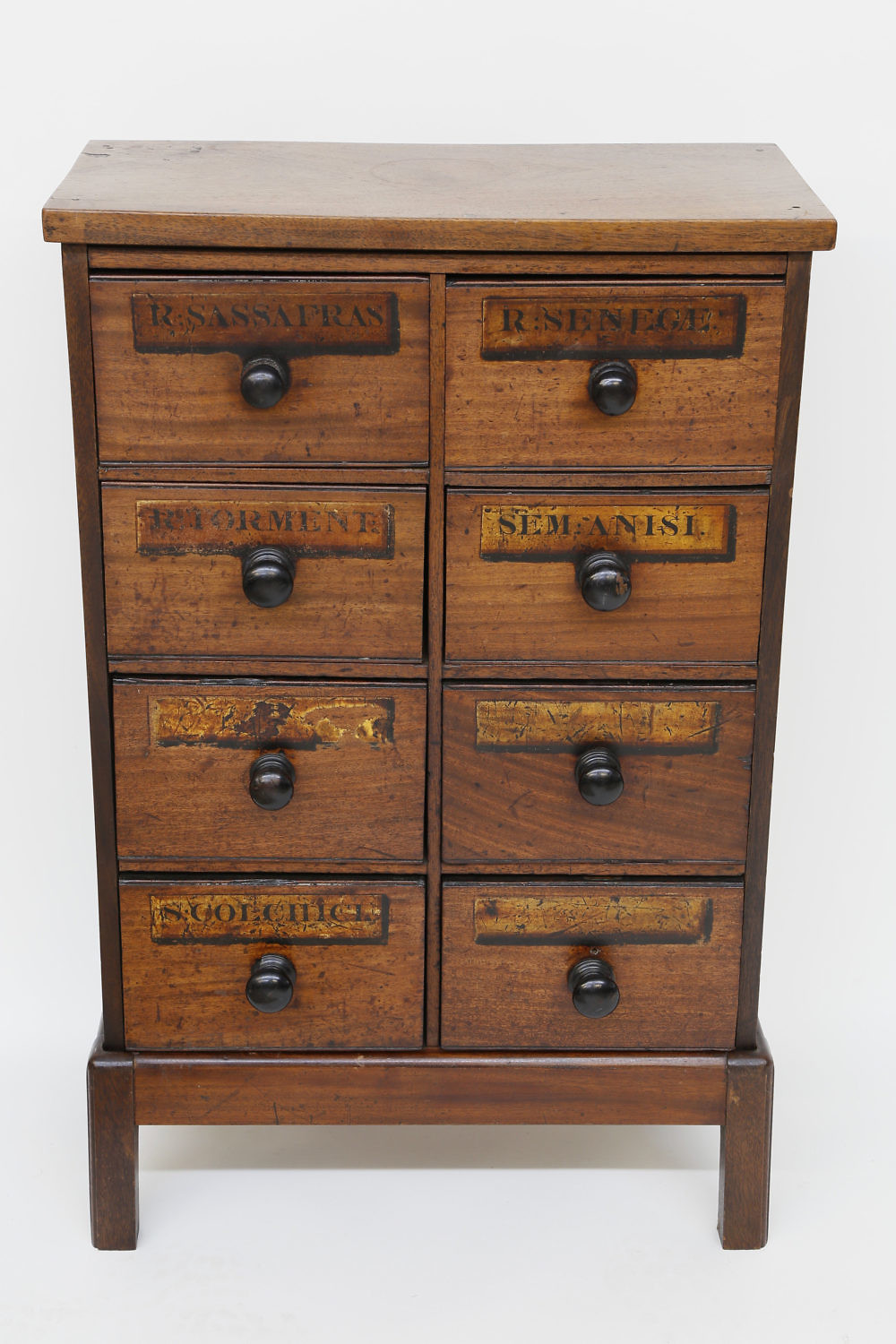 19th Century American Walnut 8 Drawer Apothecary Cabinet Consign Now DeptFurniture/Decorative ArtsSizeHeight 30 in. Width 19 ¼ in. Depth 10 in. 19th Century American Walnut 8 Drawer Apothecary Cabinet, “R. Sassafras, R. Senegae, R. Torment, Sem: Anisi, S. Colchict” labels on drawer fronts, on an antique stand Height 30 in. Width 19 ¼ in. Depth 10 in. Please note that this auction has ended. Click here for an overview of this auction.