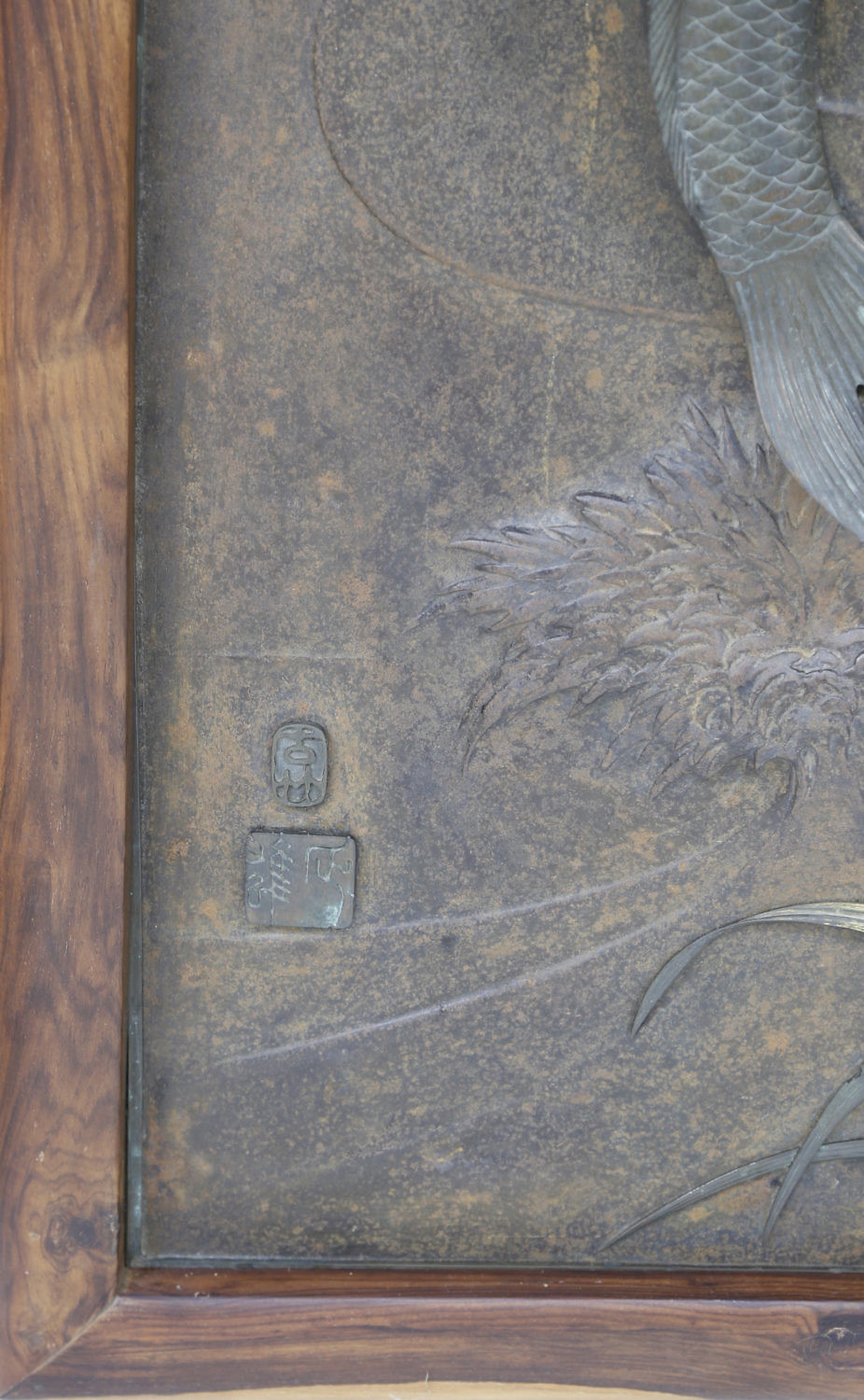 19th Century Japanese Mixed Metal Jumping Carp Plaque, Edo Period, converted into a teak wood coffee table, depicting a carp leaping from the cattails for a fly, signed lower left with a metal chalk mark