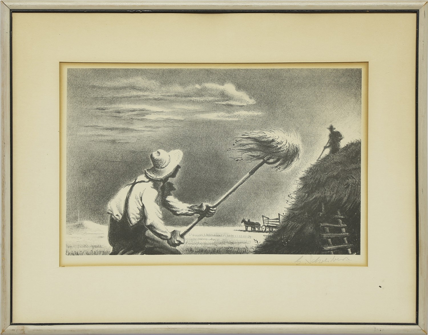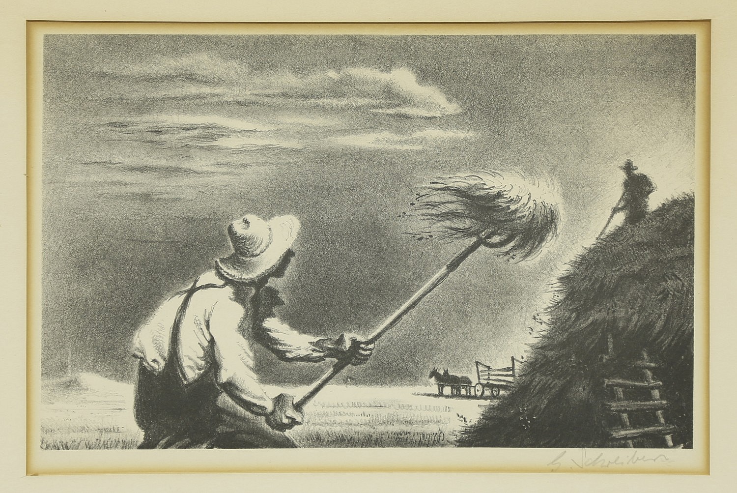 Georges Schreiber (New York / Belgium 1904-1977), Lithograph “Haying”, circa 1930s, produced in 1936 for TE WPA the Federal Art Project (1935-1941), pencil signed lower right G. Schreiber.