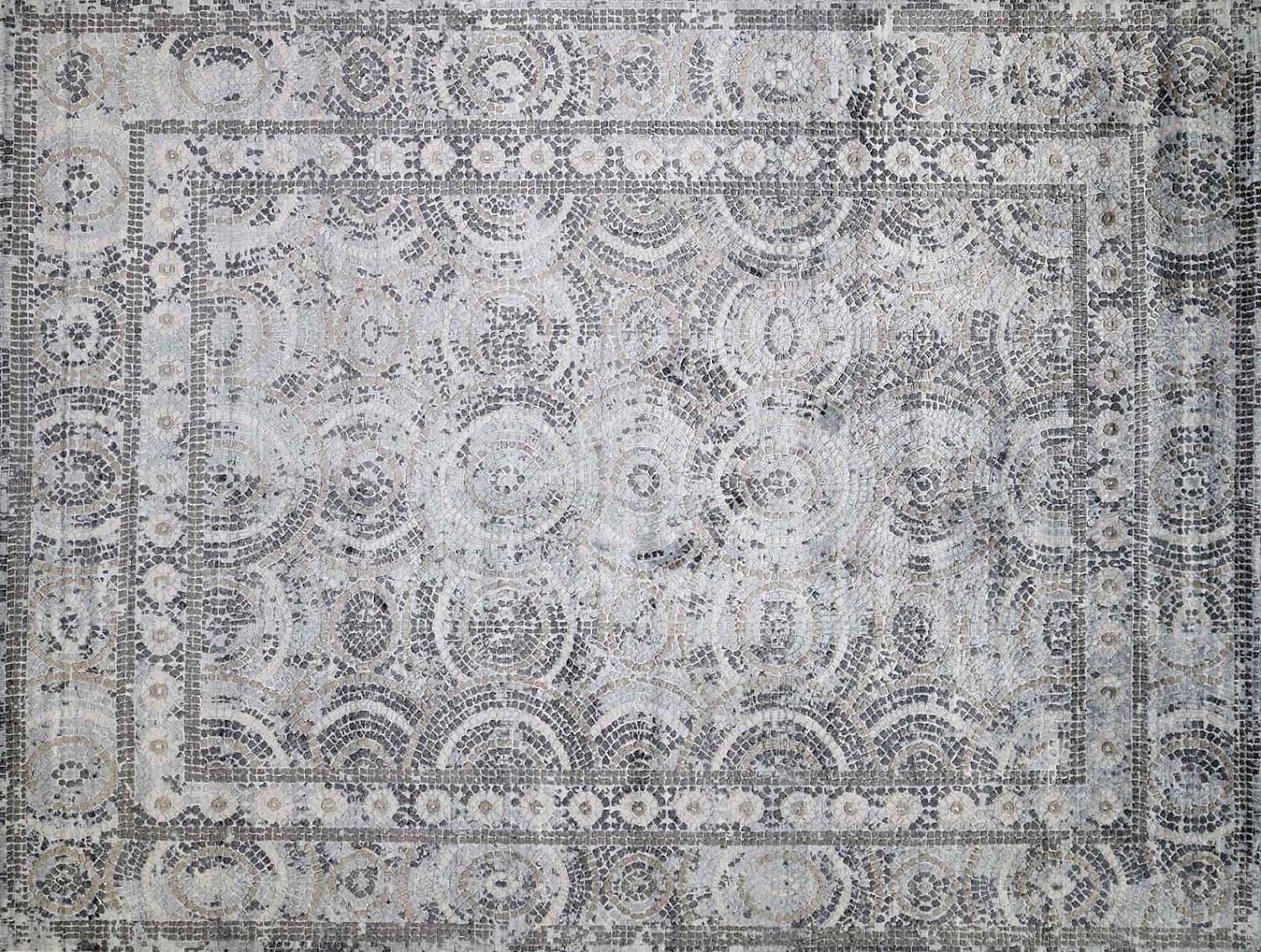 Hand Knotted Grey and White Silken Roman Mosaic Design Oriental Carpet