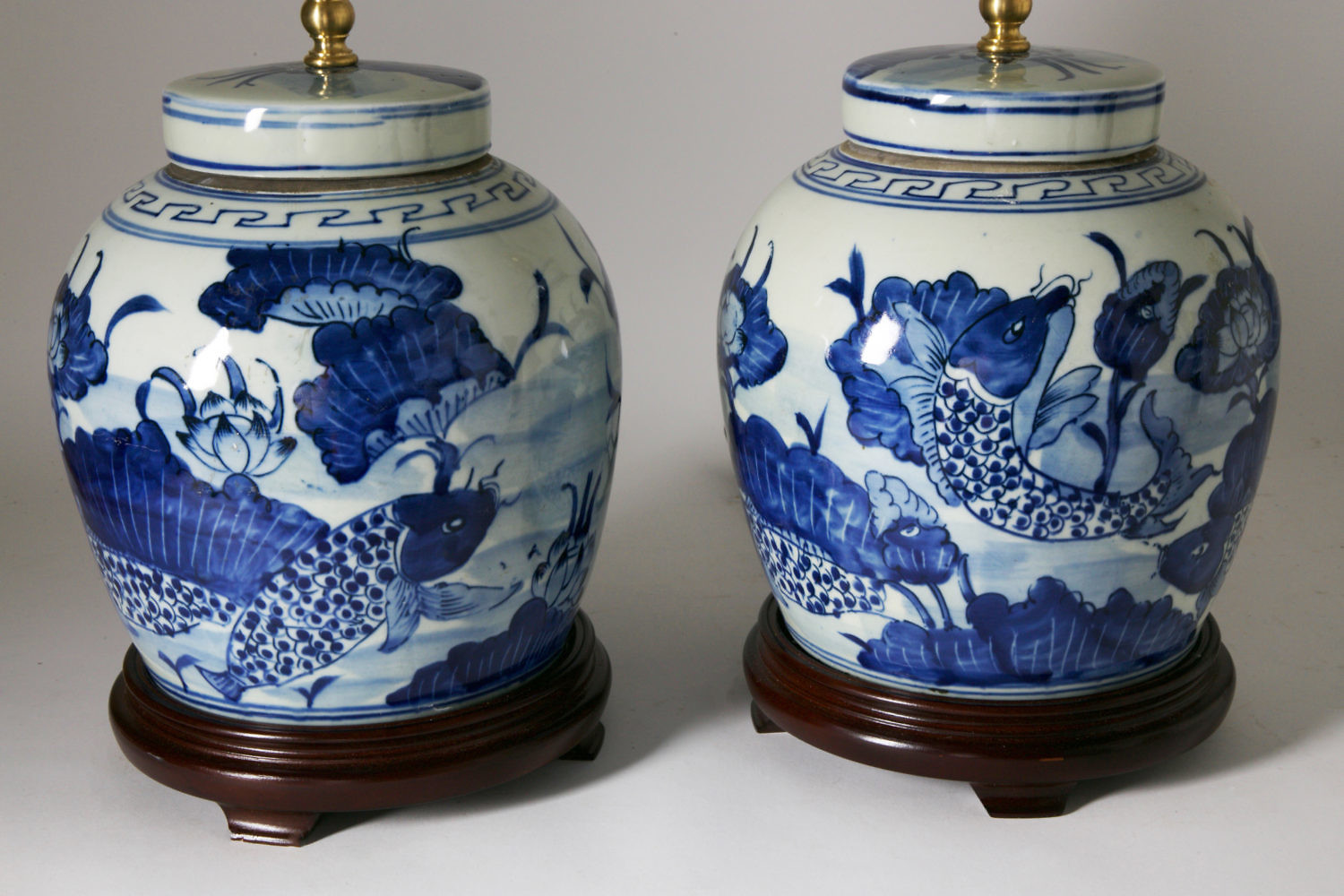 Pair of Chinese Blue and White Carp Decorated Ginger Jar Lamps Consign Now DeptFurniture/Decorative ArtsSizeHeight 11 ½ in. Pair of Chinese Blue and White Carp Decorated Ginger Jar Lamps, teak wood bases and white drum shades Height 11 ½ in. Please note that this auction has ended. Click here for an overview of this auction.