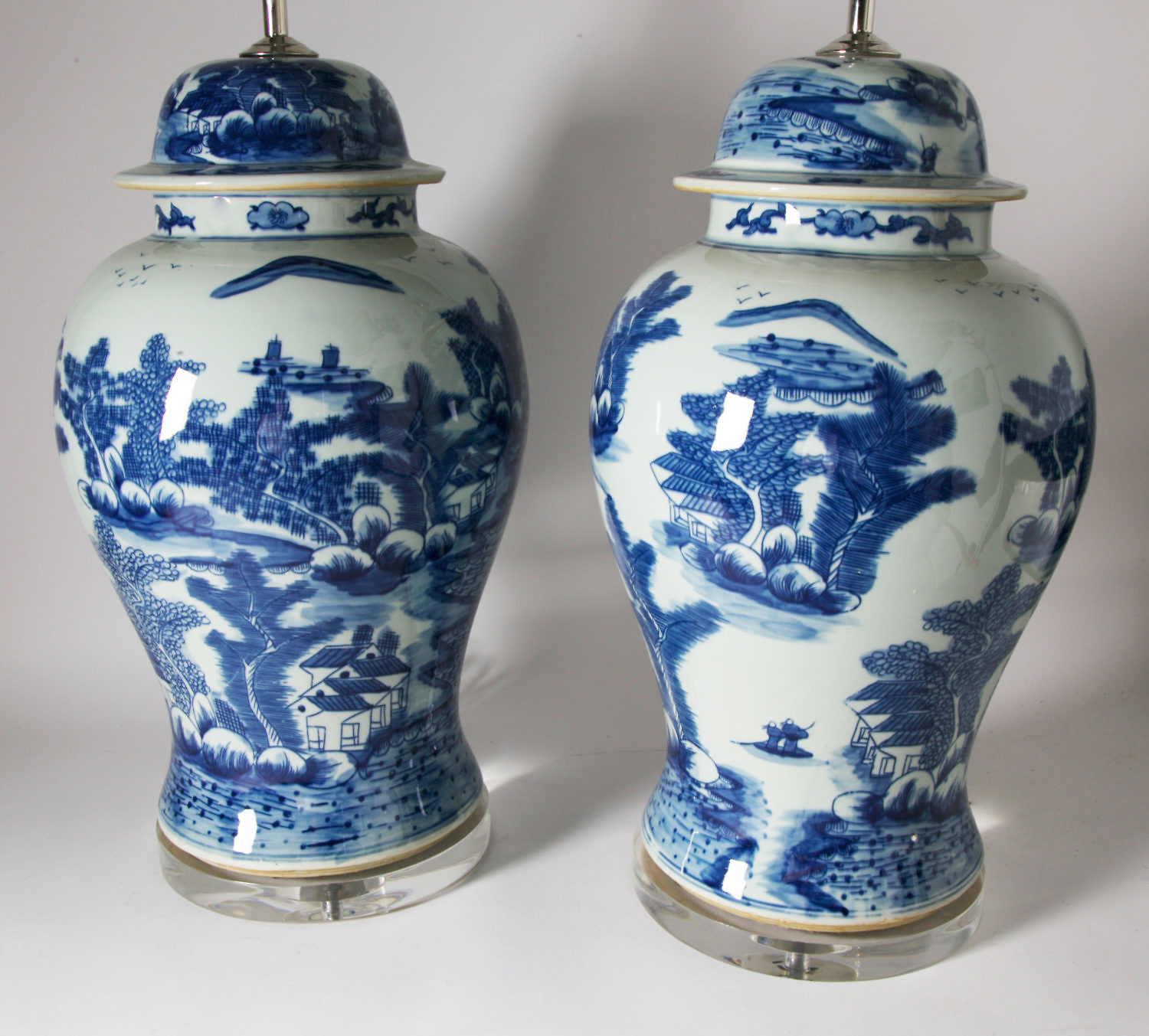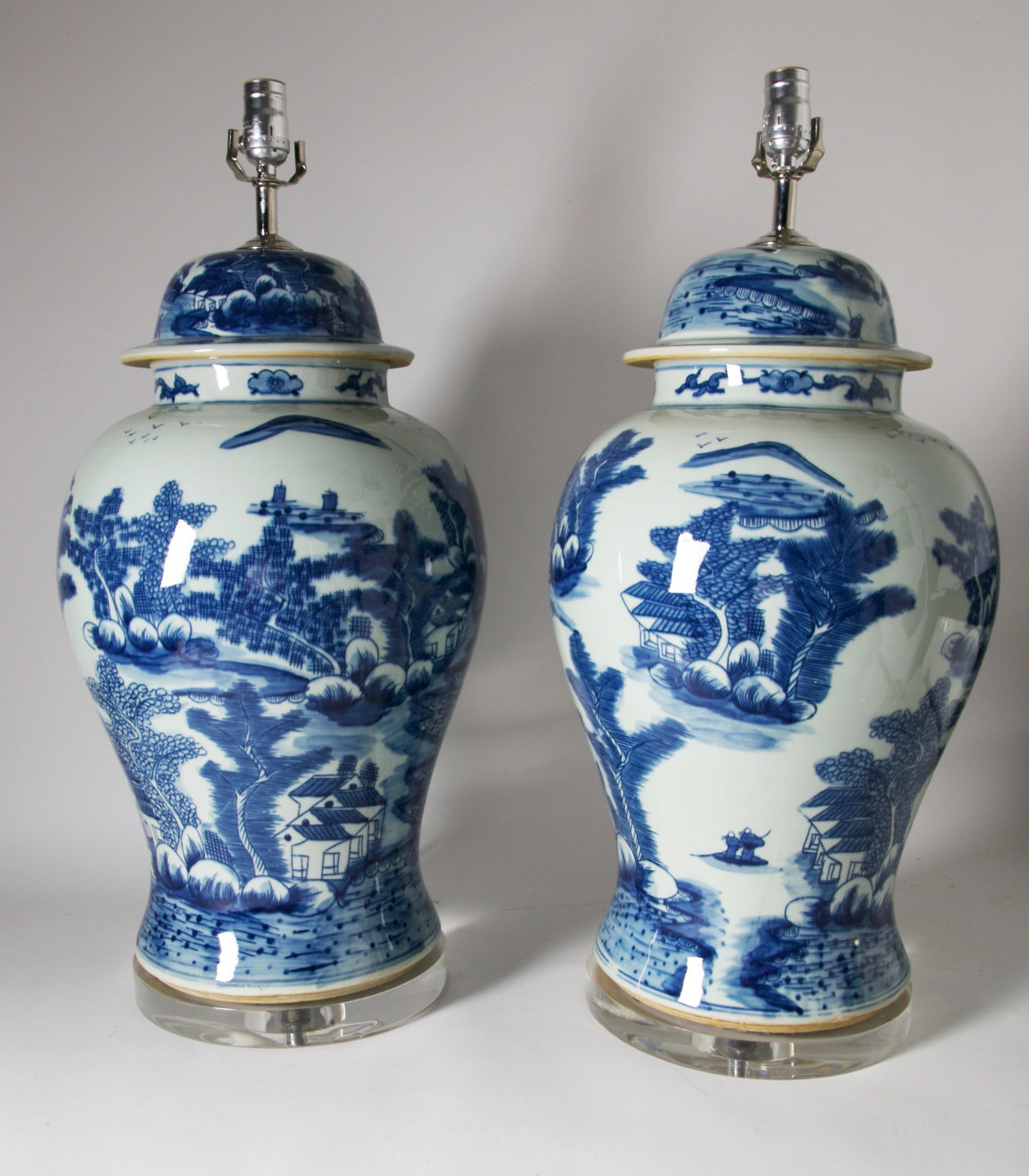 Pair of Chinese Blue and White River Landscape Decorated Temple Jar Lamps