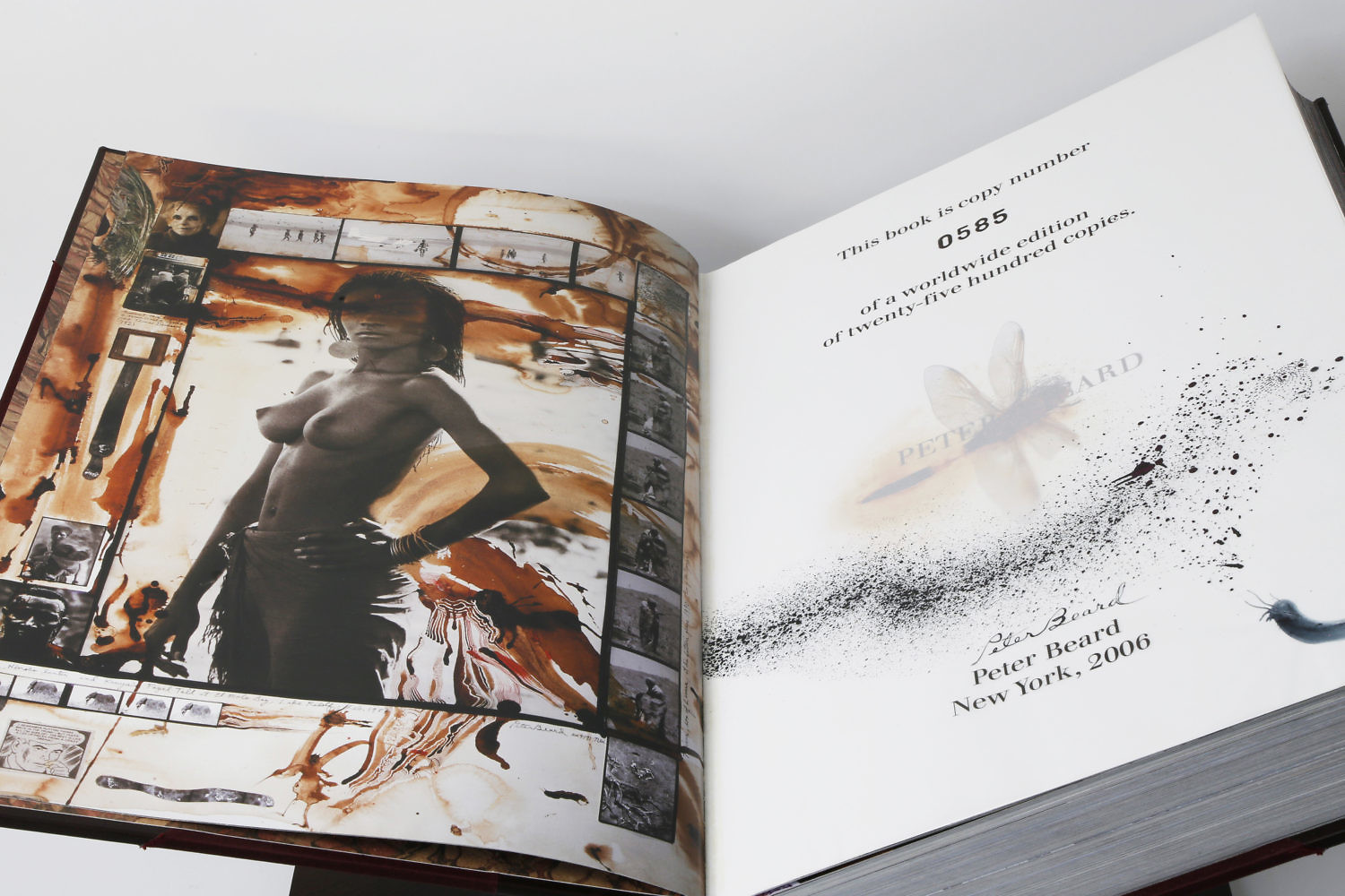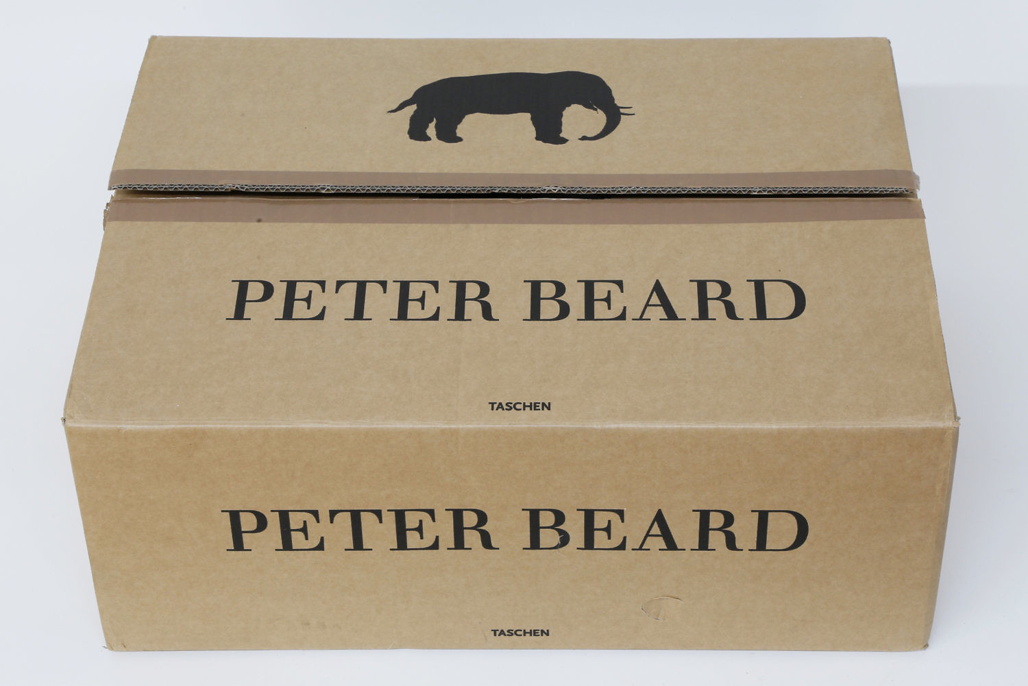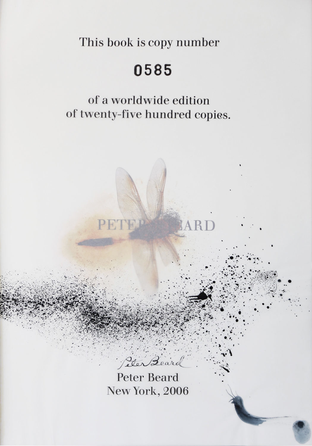 Peter Beard: Art Edition, Signed and Numbered 0585, 2006, “This book is copy number 0585 of a worldwide edition of twenty-five hundred copies. Peter Beard, Peter Beard New York, 2006“, Edited by Nejma Beard and David Fahey, Designed by Ruth Ansel. This edition comes in a clamshell box with wood book stand, XXL format.