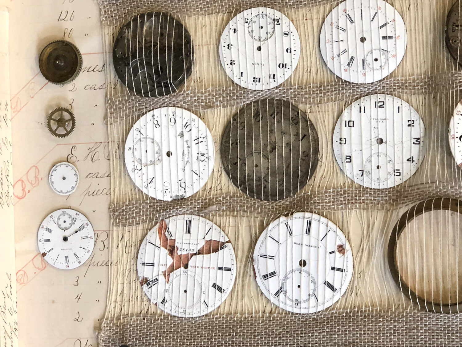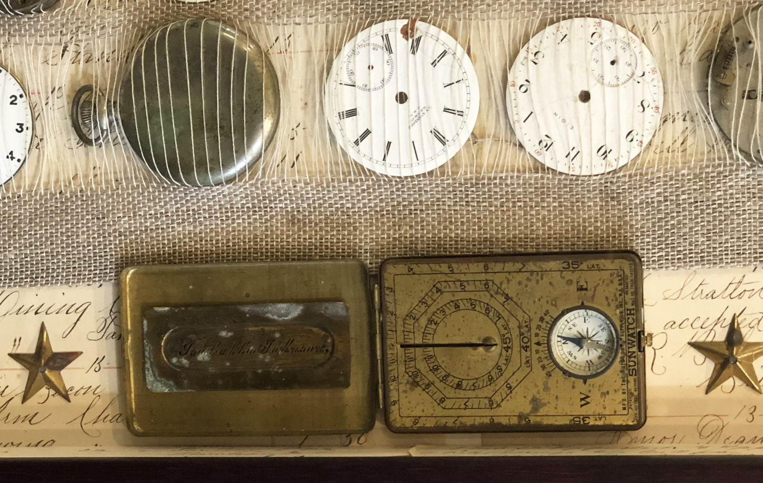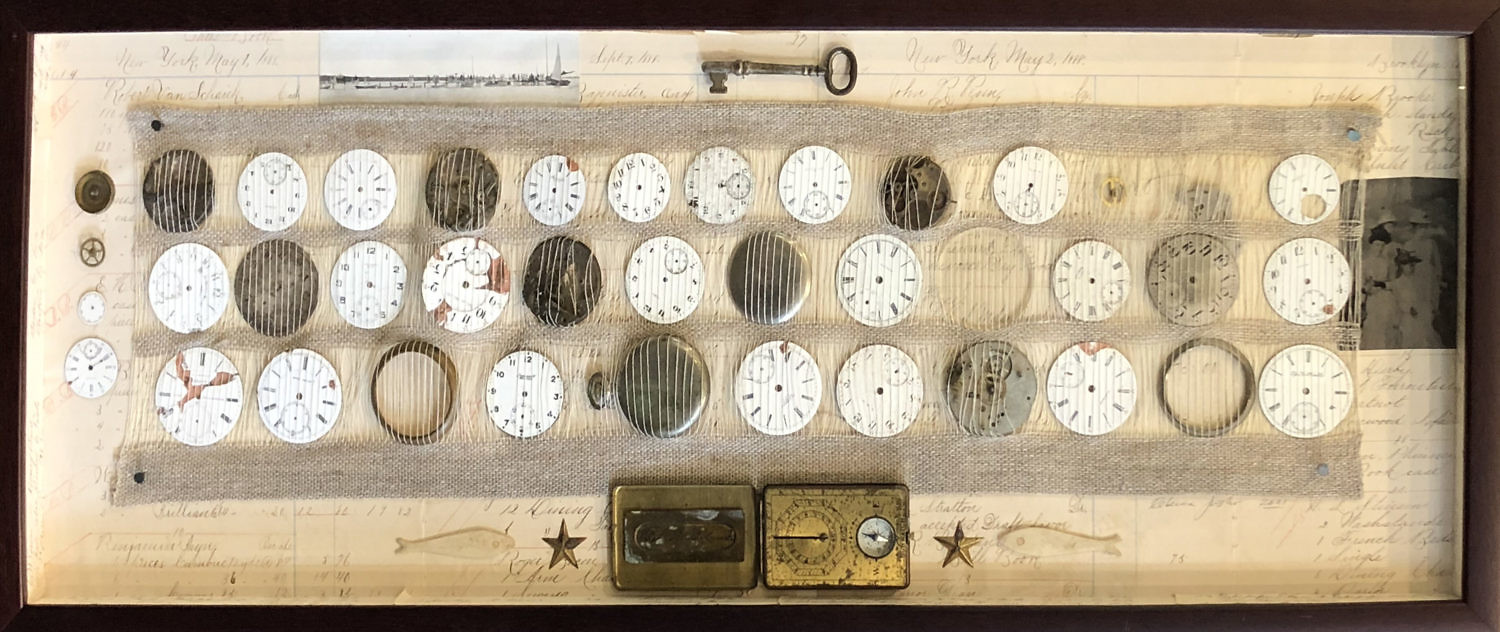 Rebecca Jusko Hand Woven Textile and Watch Face Collage Consign Now DeptFurniture/Decorative ArtsSize12 in. x 30 ¼ in. Rebecca Jusko Hand Woven Textile and Watch Face Collage with daguerreotype, two bone fish and compass all in a shadowbox. 12 in. x 30 ¼ in. Please note that this auction has ended. Click here for an overview of this auction.