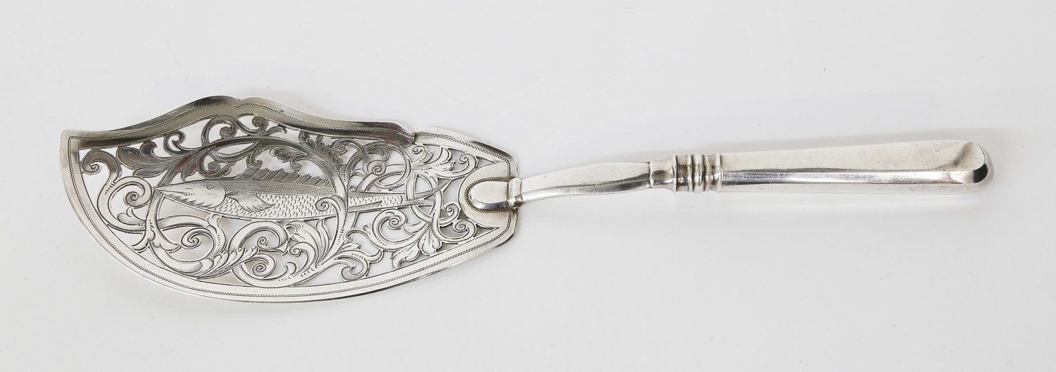 Russian Silver (84) Engraved and Pierced Fish Server Consign Now DeptSilverSizeLength 13 ½ in. Width 3 ½ in. Russian Silver (84) Engraved and Pierced Fish Server , circa 1900 Length 13 ½ in. Width 3 ½ in. Please note that this auction has ended. Click here for an overview of this auction.