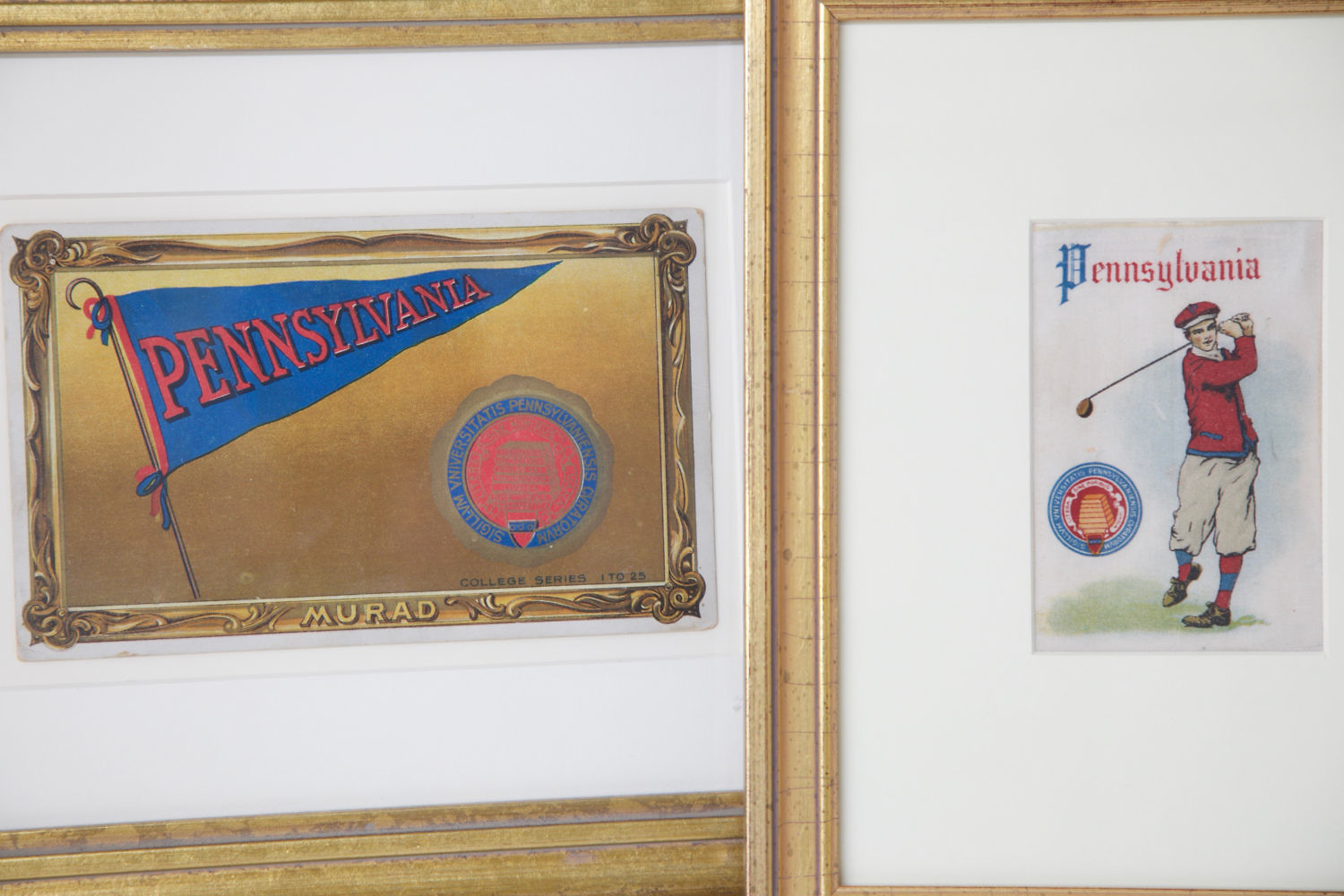 Two 19th Century Pennsylvania Cigar Silks, in gilt frames, one depicting a golfer, the other a University pennant, “College Sereies 1 to 25”