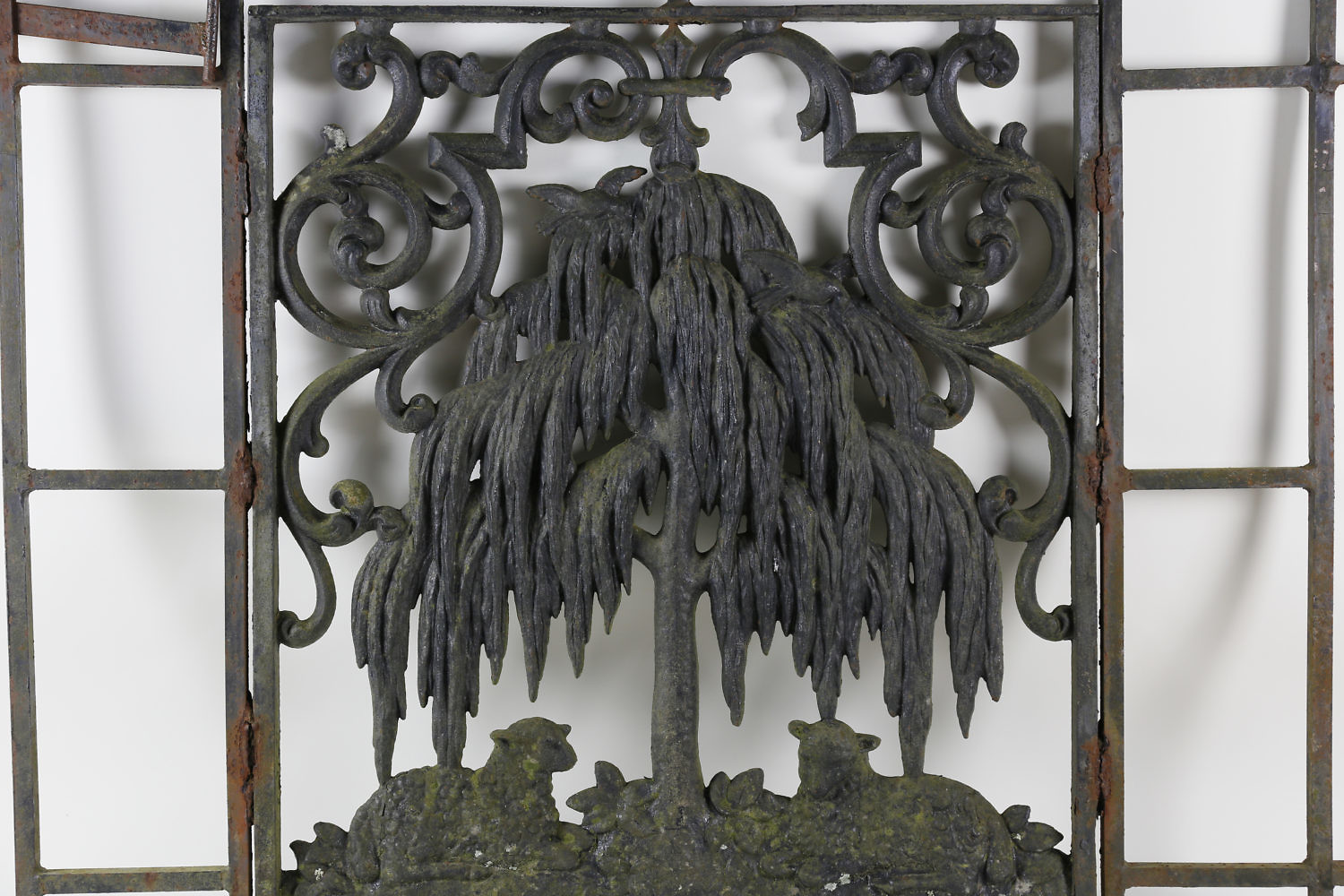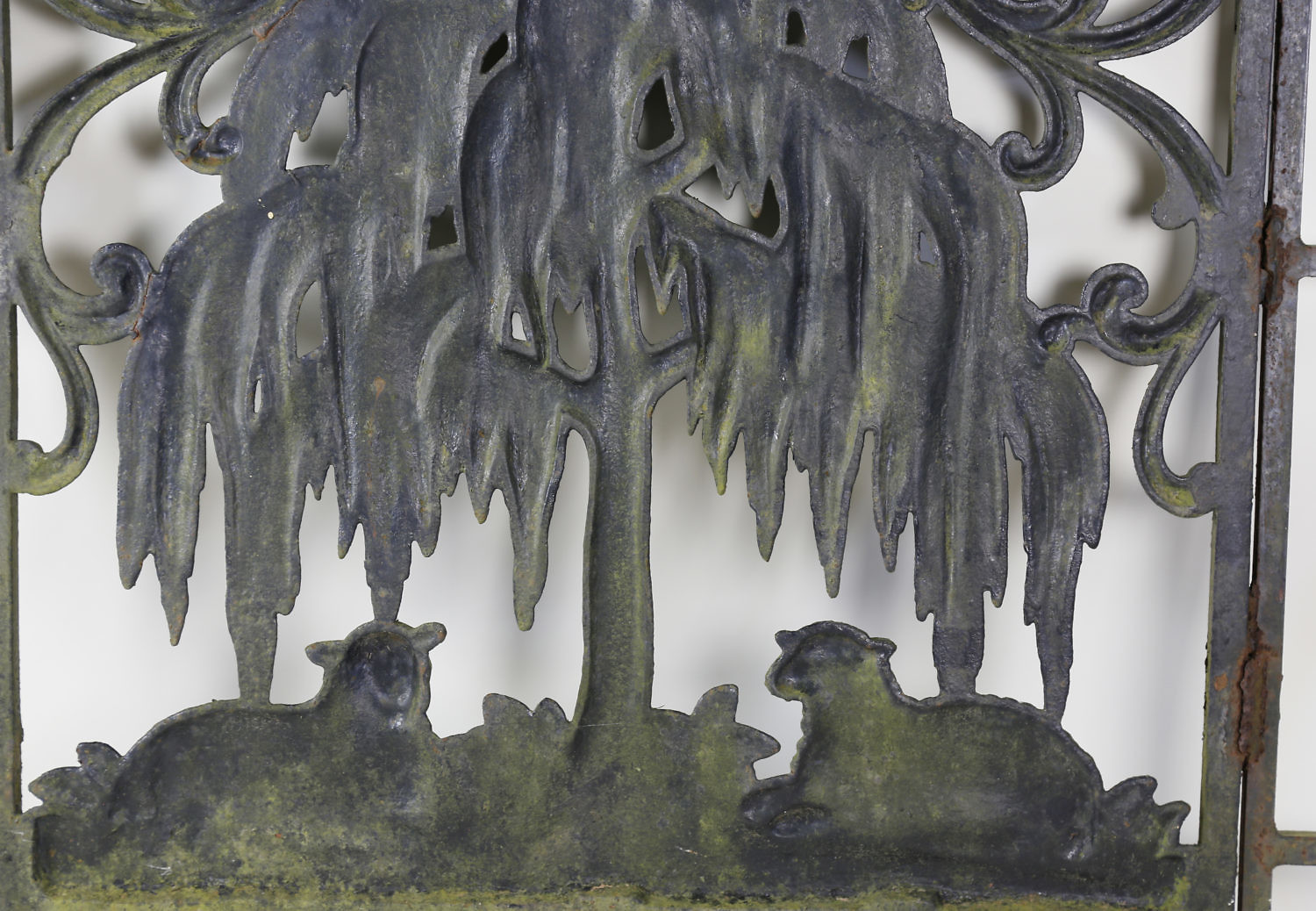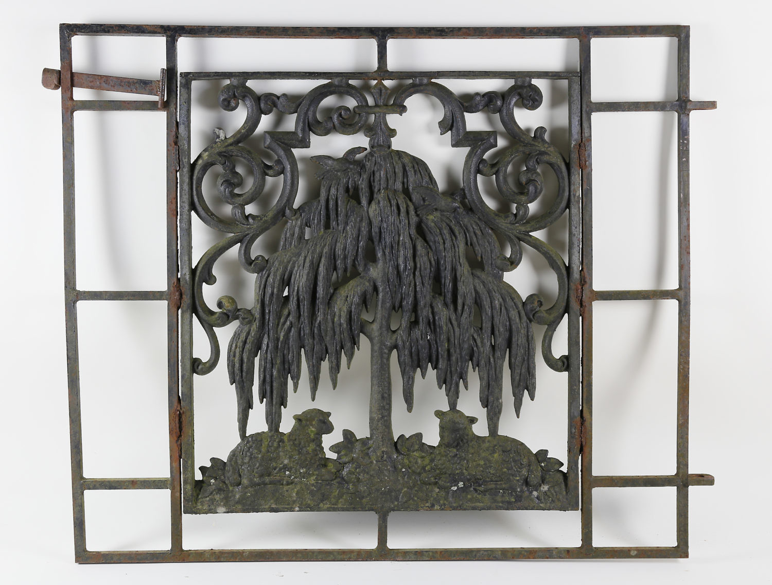 American Cast Iron Gate, circa 1820-1840 Consign Now DeptFurniture/Decorative ArtsSize36 ¾ in. x 42 ½ in. Sold for $4,063 American Cast Iron Gate, circa 1820-1840, reclining sheep under a large weeping willow tree and birds within scrolls. 36 ¾ in. x 42 ½ in. Please note that this auction has ended. Click here for an overview of this auction.