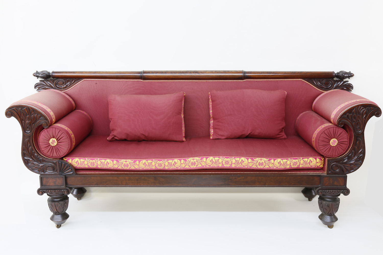 American Classical Carved Mahogany Sofa, 19th Century Consign Now DeptFurniture/Decorative ArtsSizeHeight 36 ½ in. Length 85 ½ in. Depth 23 in. Sold for $2,223 American Classical Carved Mahogany Sofa, 19th Century, floral carved cornucopia arm supports, acanthus carved legs. Height 36 ½ in. Length 85 ½ in. Depth 23 in. Please note that this auction has ended. Click here for an overview of this auction.