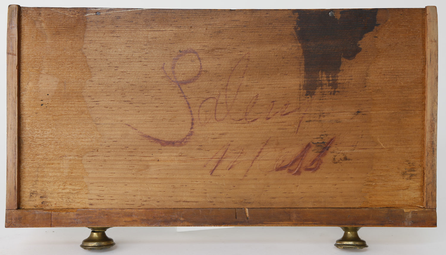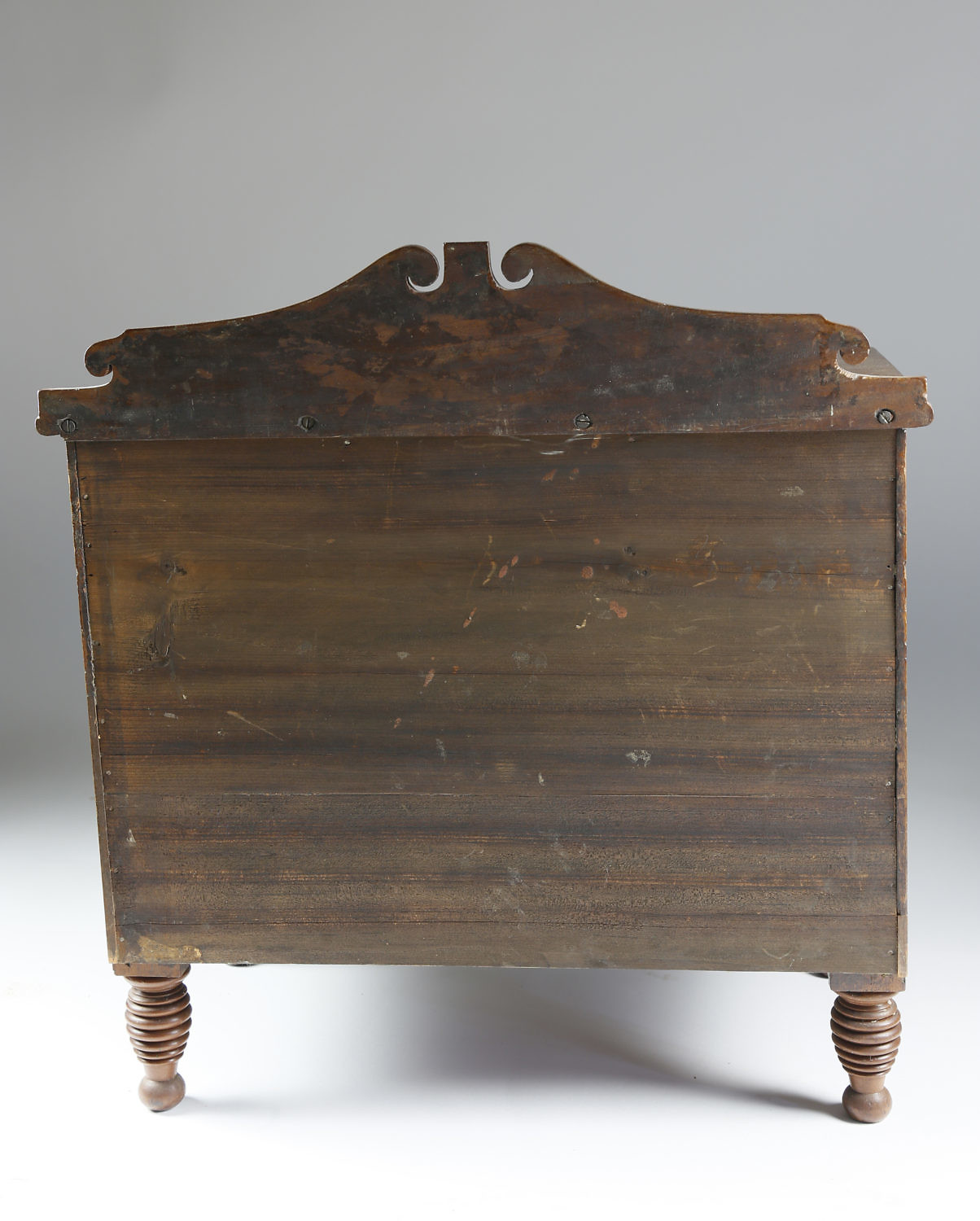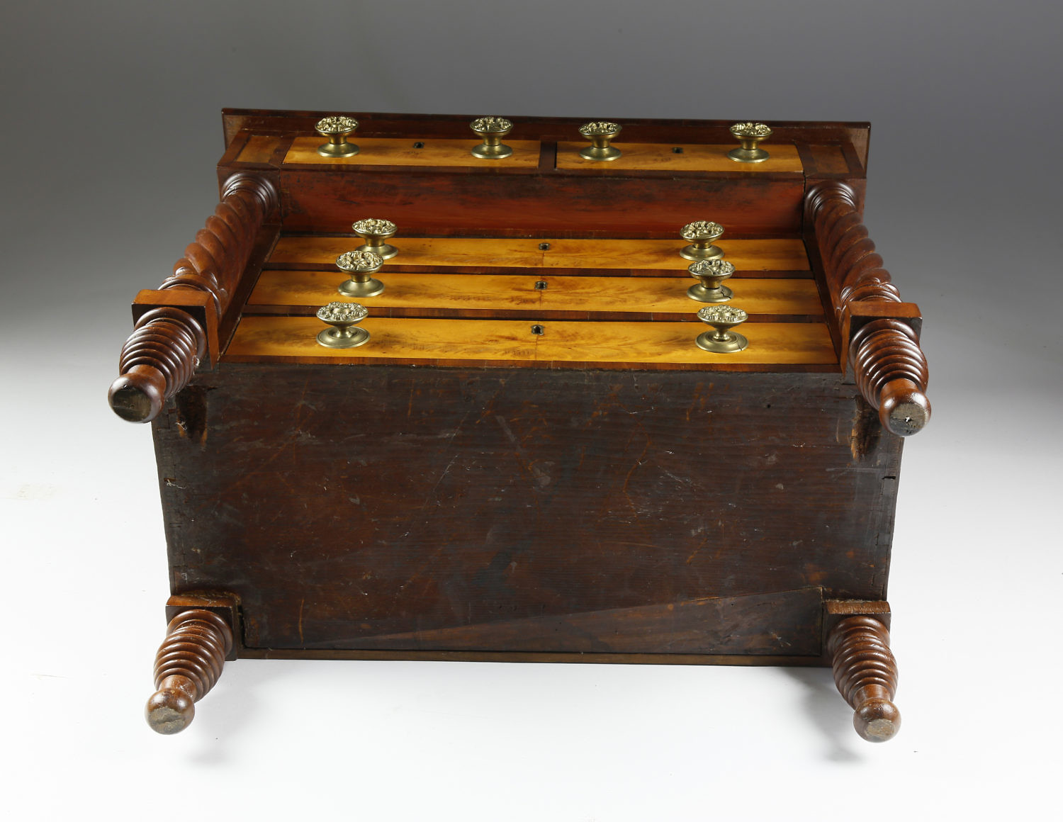 American Flame Birch Salesman’s Sample Chest of Drawers, circa 1825, mahogany case with splashback and rope turned columns flanking two over three mirrored birch veneered drawers with repoussé brass pulls, on 4 multi-turned feet, inscribed “Salem, Mass.” under a drawer.