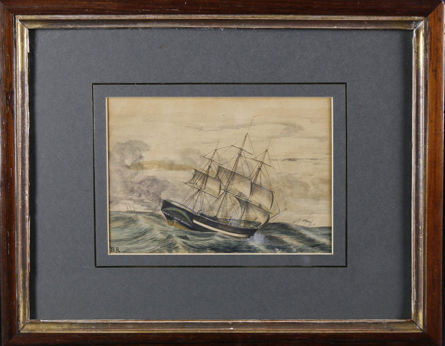 Benjamin Russell (American 1804-1885) Watercolor on Paper “Stern View of the Vessel Milo, a Whaler Out of New Bedford,” circa 1830, the Milo on the high seas with two vessels on the horizon and storm clouds, initialed lower left B.R.