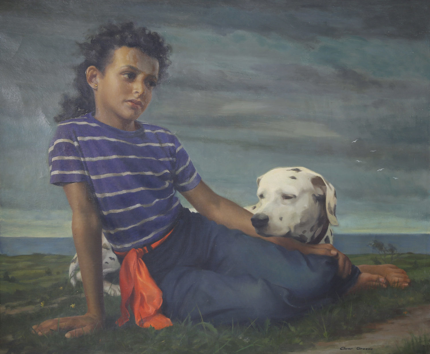 Elmer Wesley Greene Jr. (Massachusetts 1907-1964) Oil on Canvas “Portrait of a Young Girl and Her Dog“, signed lower right Elmer Greene, in natural carved wood frame. Exhibition label from the Kenneth Taylor Gallery – Nantucket on stretcher.