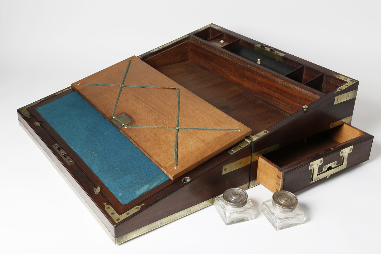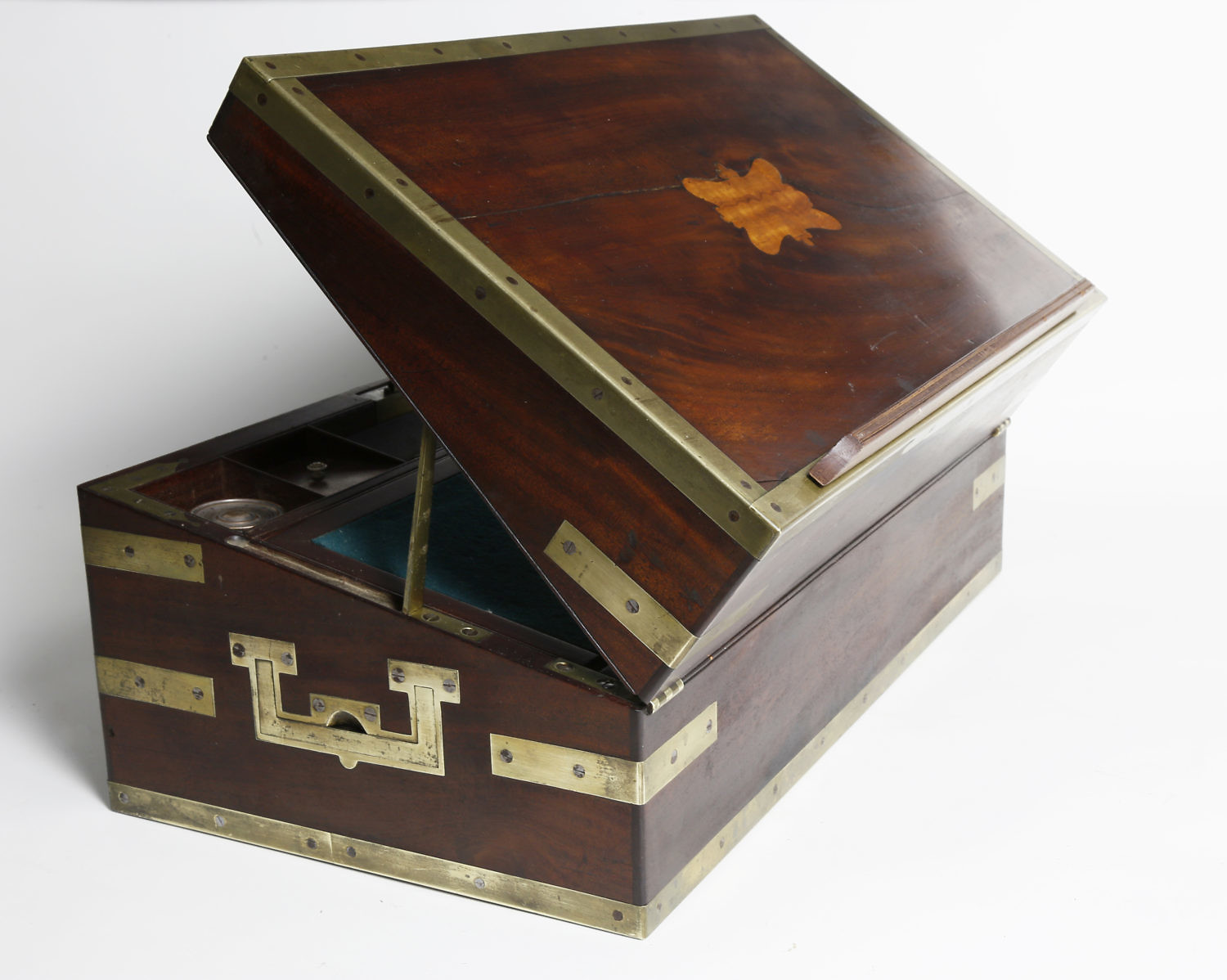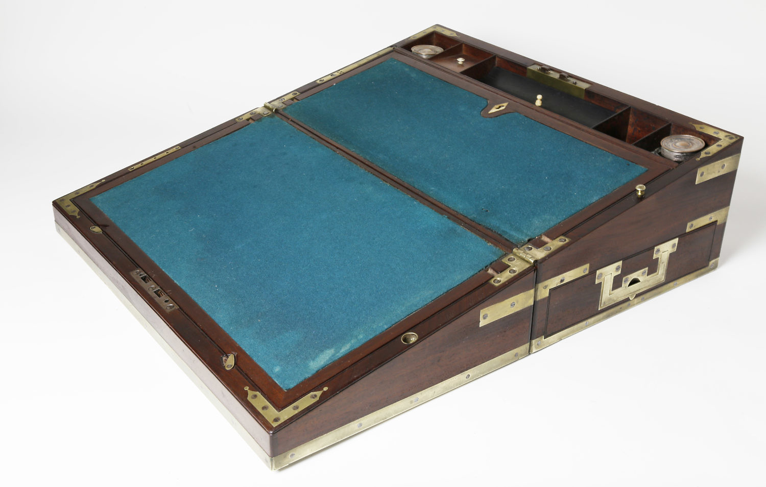 English Brass Bound Mahogany Traveling Desk Box, circa 1820 Consign Now DeptFurniture/Decorative ArtsSizeHeight 7 in. Length 18 in. Depth 10 in. Sold for $1,000 English Brass Bound Mahogany Traveling Desk Box, circa 1820, stamped W. Muckleston on the Bramah lock. All brasses secured with 172 silver screws, two paper storage compartments, original inkwells, book rail and side drawer. Height 7 in. Length 18 in. Depth 10 in. Please note that this auction has ended. Click here for an overview of this auction.