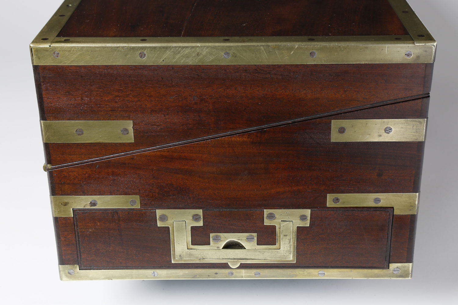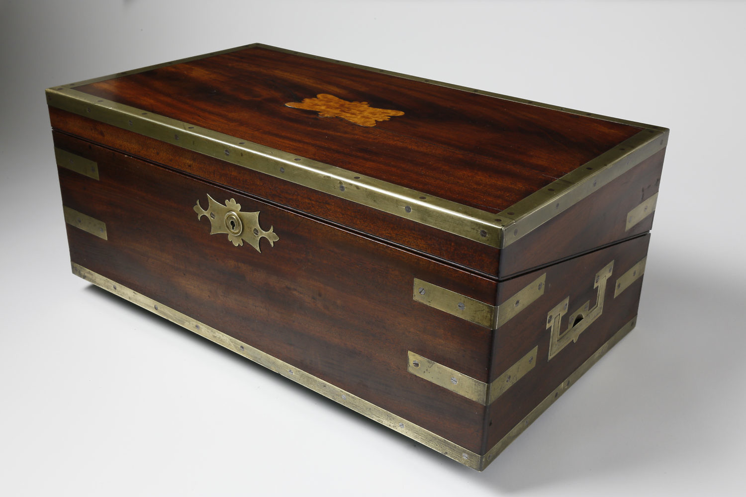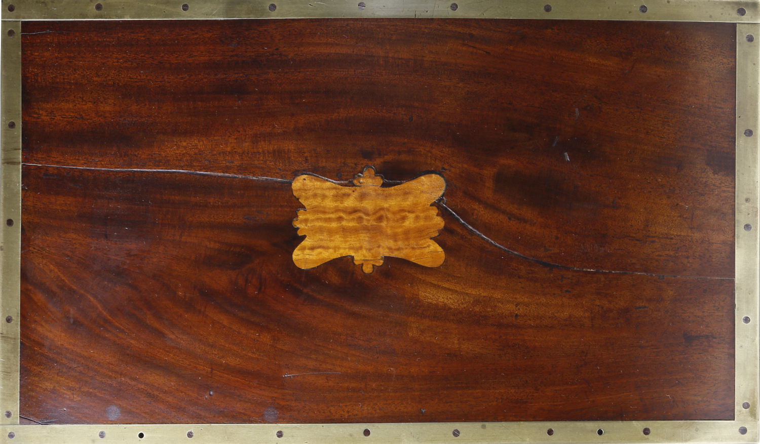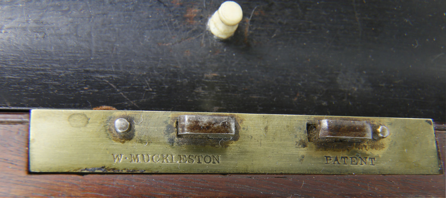 English Brass Bound Mahogany Traveling Desk Box, circa 1820 Consign Now DeptFurniture/Decorative ArtsSizeHeight 7 in. Length 18 in. Depth 10 in. Sold for $1,000 English Brass Bound Mahogany Traveling Desk Box, circa 1820, stamped W. Muckleston on the Bramah lock. All brasses secured with 172 silver screws, two paper storage compartments, original inkwells, book rail and side drawer. Height 7 in. Length 18 in. Depth 10 in. Please note that this auction has ended. Click here for an overview of this auction.