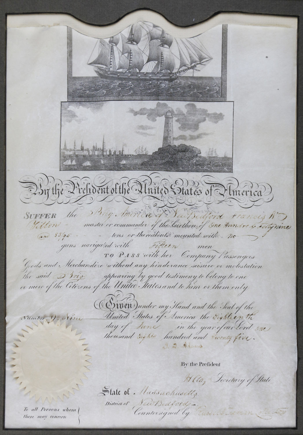 John Quincy Adams Presidential Passport for the Bark “America” of New Bedford – Francis Yitton Master, June 18, 1825 Consign Now DeptAmericana and Folk Arts, CollectionsSize14 in. x 10 in. Overall 21 in. x 16 ¼ in. John Quincy Adams Presidential Passport for the Bark “America” of New Bedford – Francis Yitton Master, June 18, 1825, signed J.Q. Adams. 14 in. x 10 in. Overall 21 in. x 16 ¼ in. Please note that this auction has ended. Click here for an overview of this auction.
