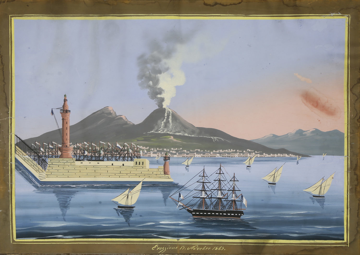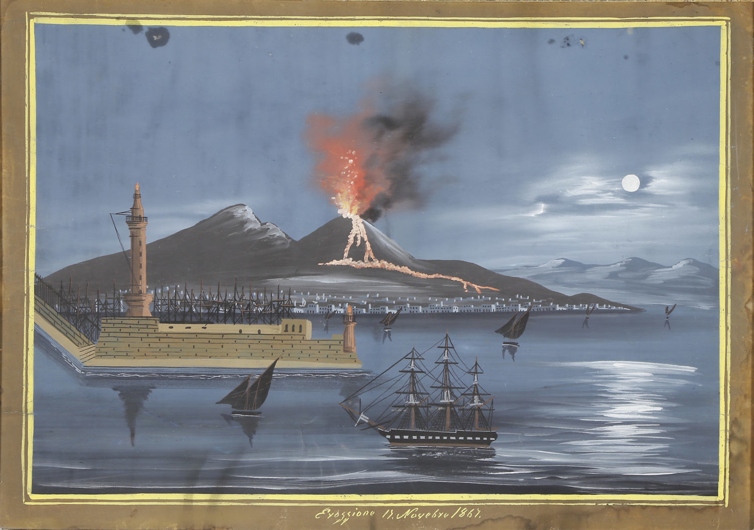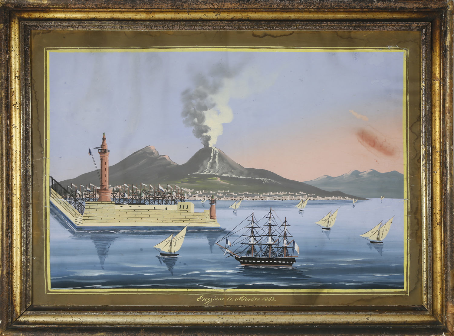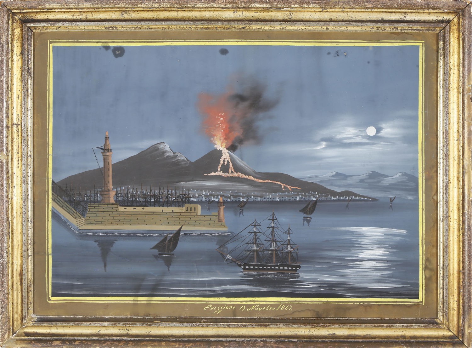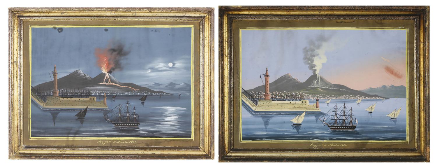 Pair of Italian Gouache “Bay of Naples and the Molo San Vincenzo Day and Night”, circa 1867, two historic views of the entrance to the Bay of Naples and the Molo San Vincenzo Lighthouse, busy harbor activity and Mount Vesuvius erupting and lava flowing in the distance; as depicted on November 17, 1867 with hand painted legend lower center “Evossione 17. Novebre 1867″, in original lemon gilt frames
