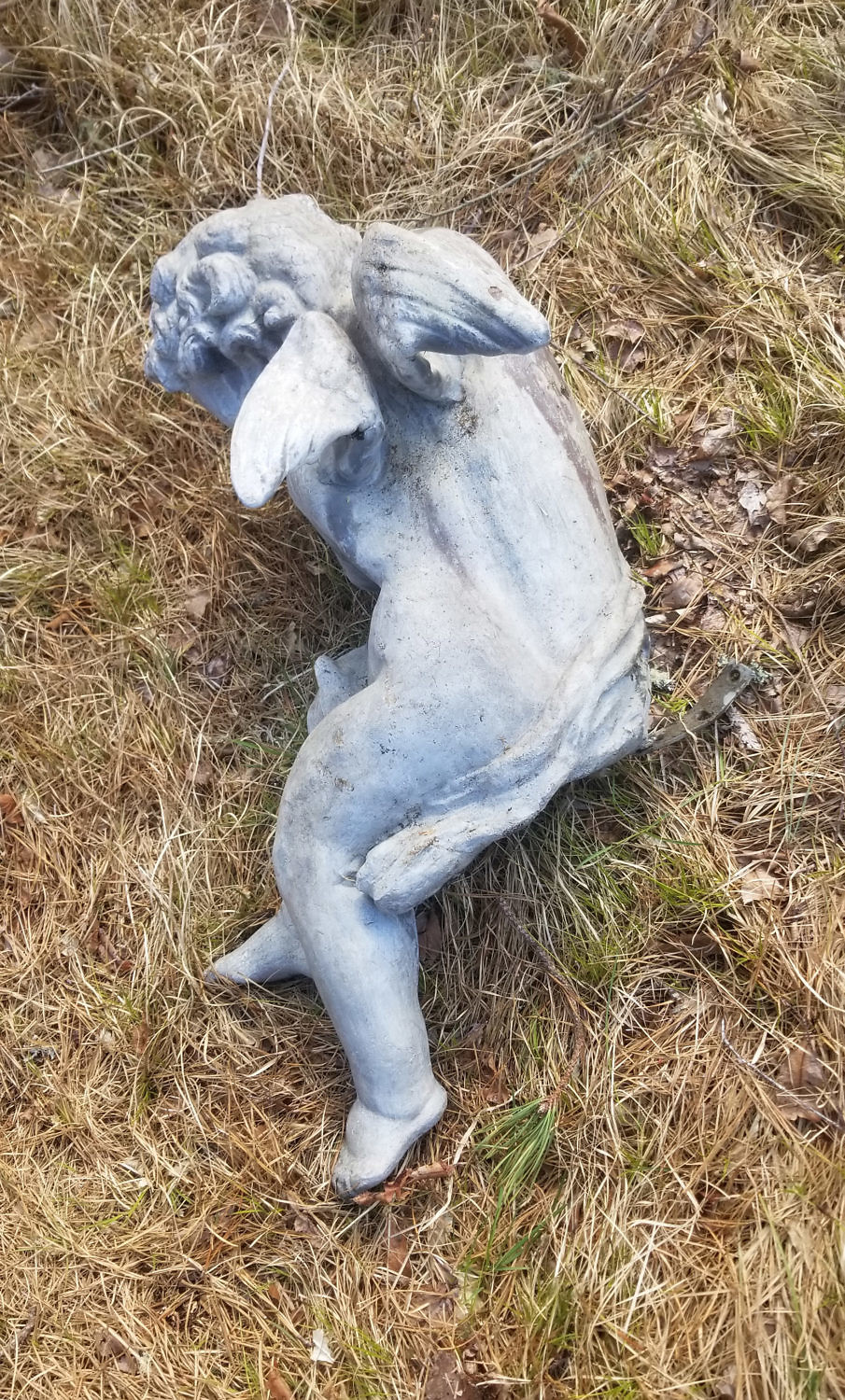 Pair of Lead Bacchus Cherub Garden Figure Sculptures, 19th Century, one holding a chalice and cluster of grapes, the other holding a chalice filled with fruit. (chairs not included)