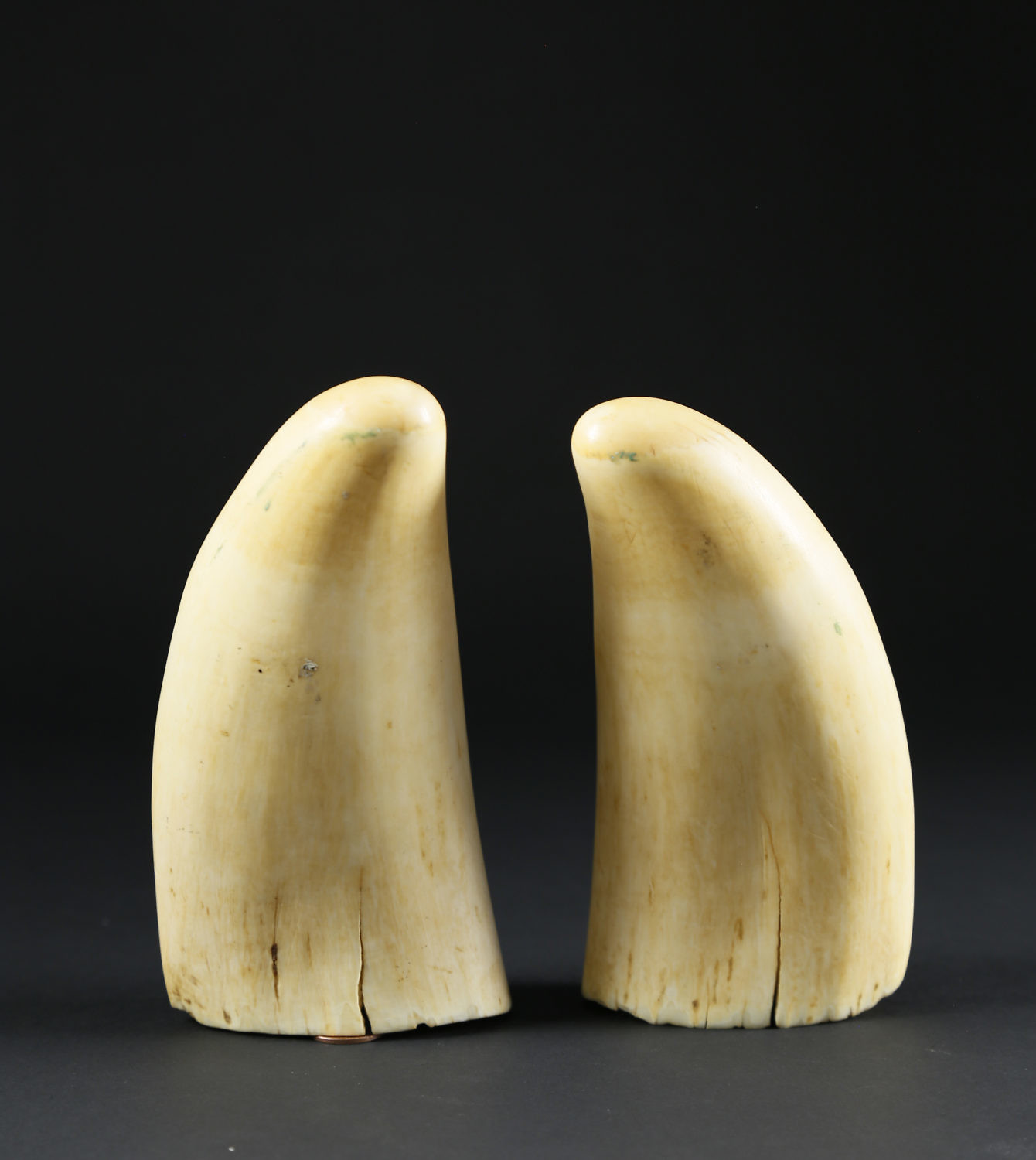 Pair of Whaler Scrimshawed and Polychromed Sperm Whale Teeth, circa 1860 Consign Now Dept19th Century Scrimshaw, Maritime ArtsSizeHeight 6 ½ in. x 3 ¼ in. Sold for $1,342 Pair of Whaler Scrimshawed and Polychromed Sperm Whale Teeth, circa 1860, both stippled and line engraved with ¾ portrait of a young lady holding a red flower, the other with a half-portrait of a seated woman wearing a red vest and pendant. Height 6 ½ in. x 3 ¼ in. Please note that this auction has ended. Click here for an overview of this auction.