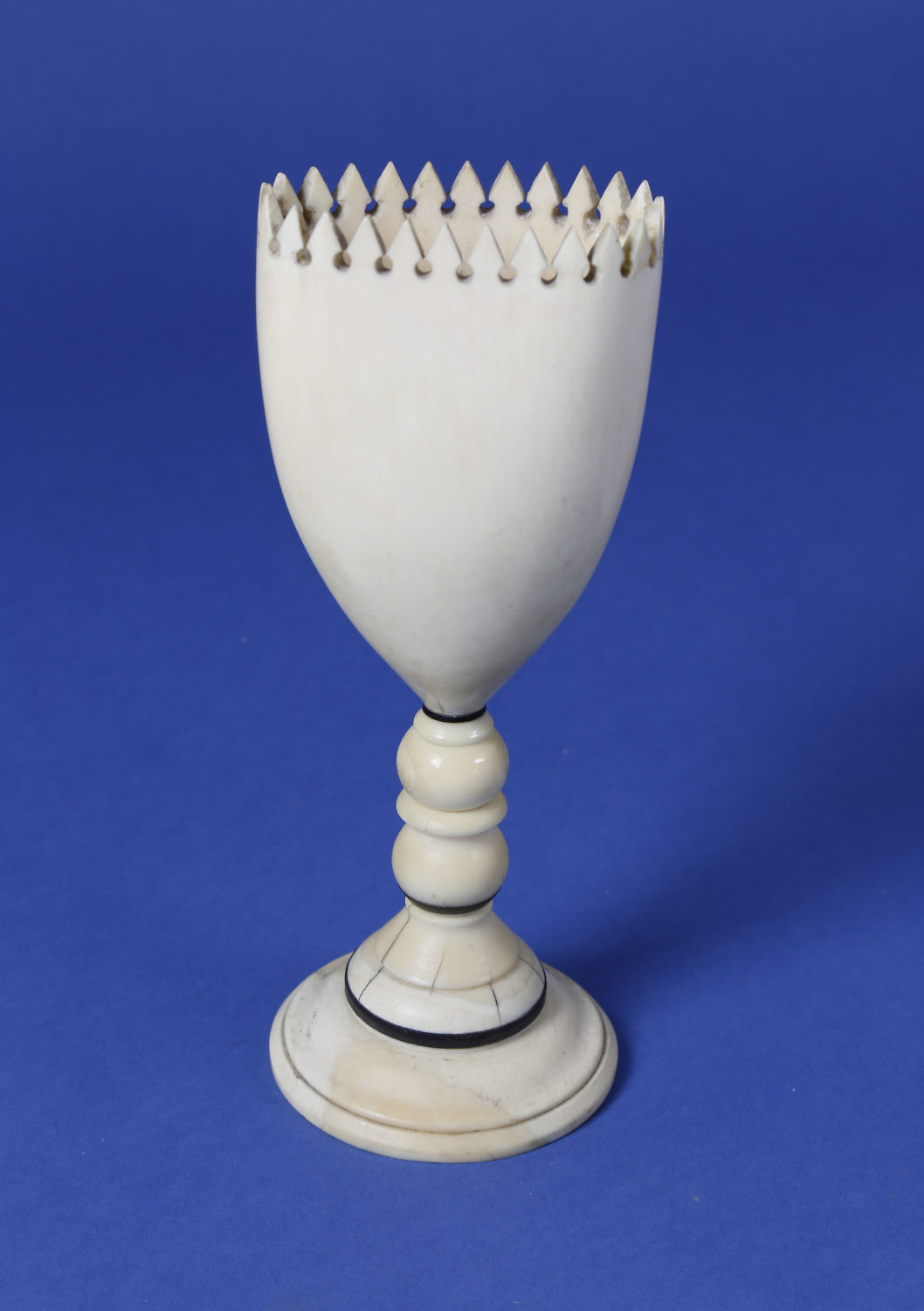 Whaler Made Sperm Whale Tooth Goblet, circa 1850 Consign Now Dept19th Century Scrimshaw, Maritime ArtsSizeHeight 7 ¼ in. Width 3 in. Depth 1 ½ in. Whaler Made Sperm Whale Tooth Goblet, circa 1850, an inverted tooth with a carved spike and dot rim mounted on a turned 3-section standard and base with 3 baleen accents. Height 7 ¼ in. Width 3 in. Depth 1 ½ in. Please note that this auction has ended. Click here for an overview of this auction.