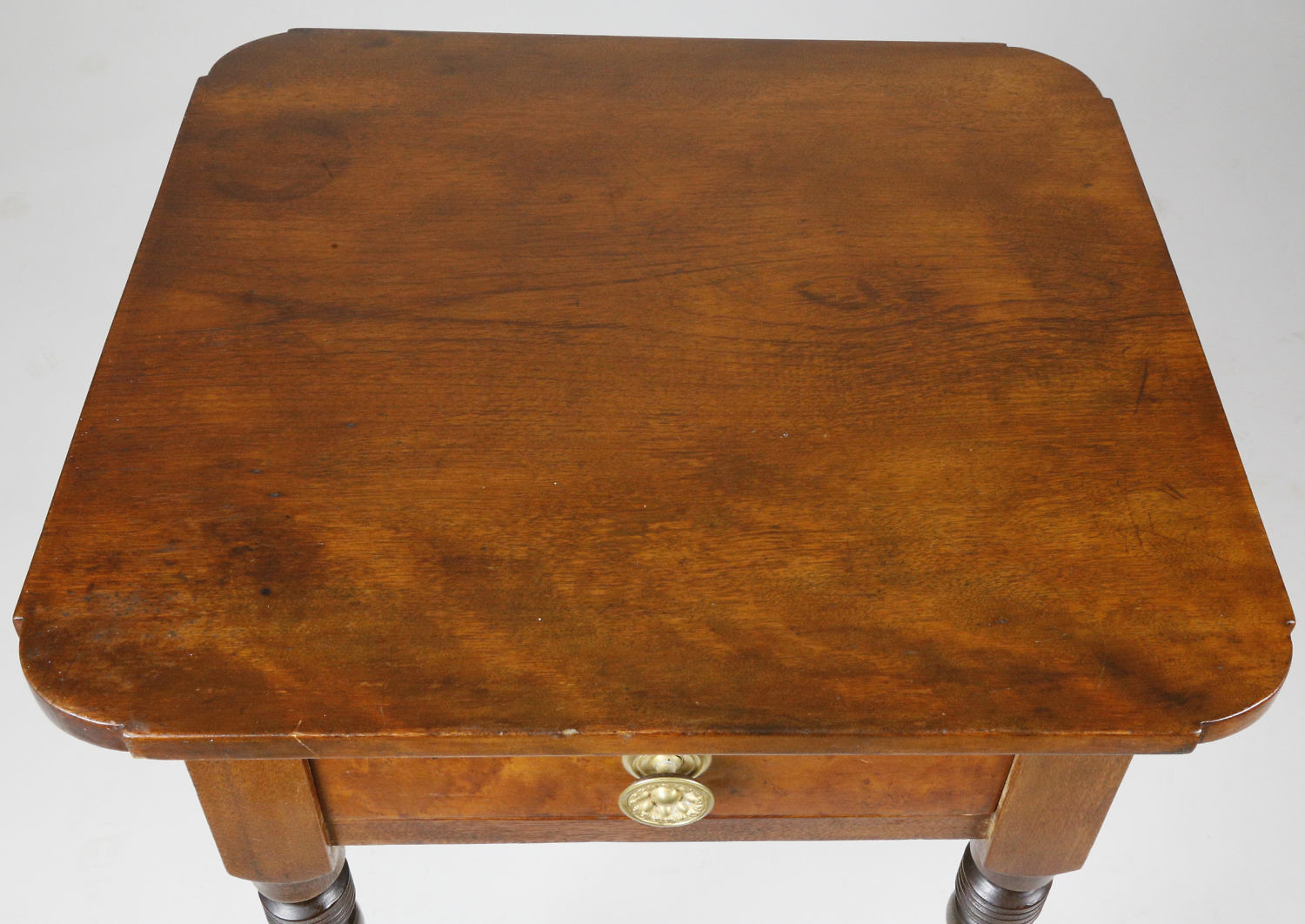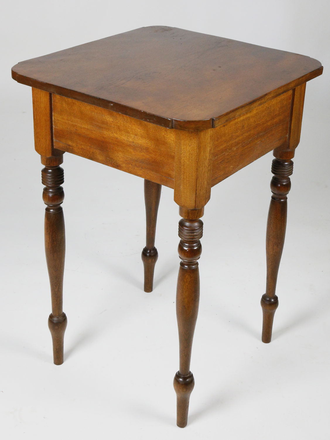 American Sheraton Maple One Drawer Stand, 19th Century Consign Now DeptFurniture/Decorative ArtsSizeHeight 26 ½ in. Width 19 in. Depth 18 in. American Sheraton Maple One Drawer Stand, 19th Century, birds eye maple drawer front, shaped top, turned legs, and brass pull. Height 26.5 in. Width 19 in. Depth 18 in. Provenance: Estate of Linda Loring, 4 Rays Court, Nantucket Please note that this auction has ended. Click here for an overview of this auction.
