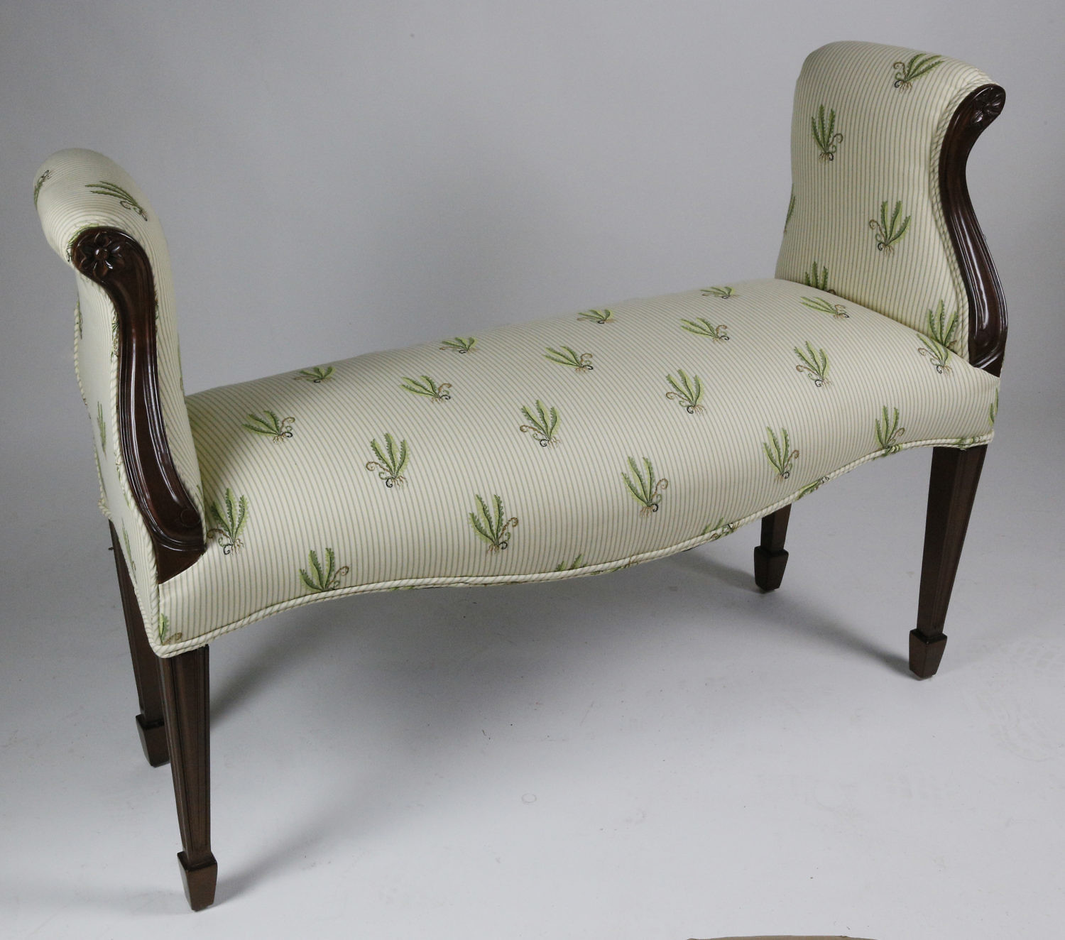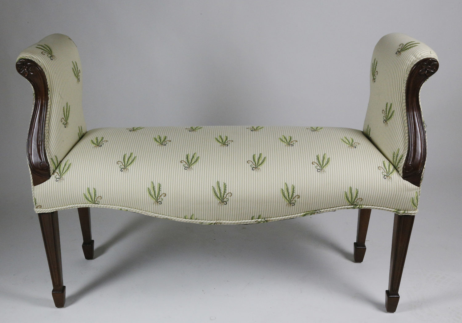 Antique Floral Upholstered Window Bench Consign Now DeptFurniture/Decorative ArtsSizeHeight 30 in. Width 44 in. Depth 15 in. Antique Floral Upholstered Window Bench, striped, with arm-rests and reeded legs. Height 30 in. Width 44 in. Depth 15 in. Please note that this auction has ended. Click here for an overview of this auction.