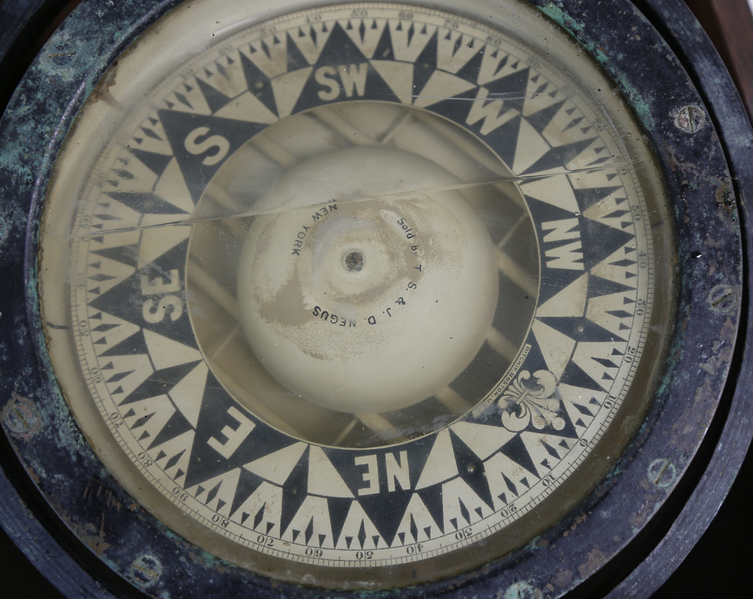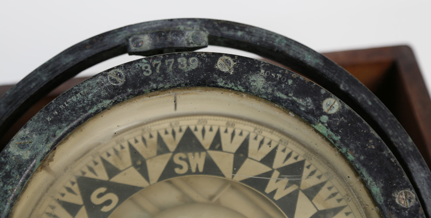 Ritchie, Boston Box Compass, 19th Century, a liftoff cover exposes a patina and painted bowl and gimbal ring stamped “Ritchie, Boston #37739”, compass card stamped “Ritchie Boston USA” and interior marked “Sold by T.S. & J.D. Negus, New York.”