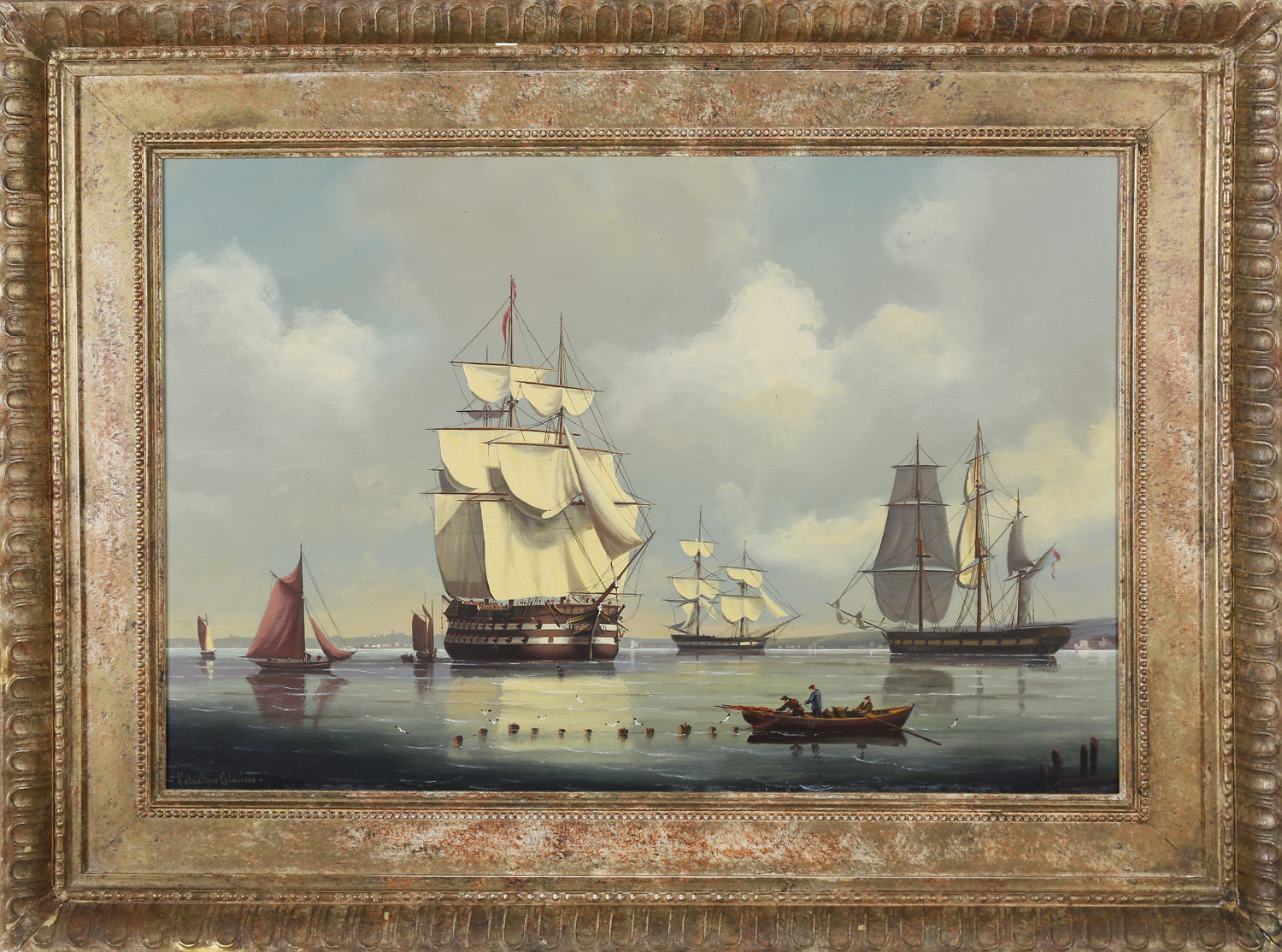 Salvatore Colacicco Oil “Man-o-War Anchored at Portsmouth Harbor” Consign Now DeptFine ArtsSize16 in. x 24 in. Overall 23 in. x 31 in. Salvatore Colacicco (Italian b. 1935) Oil on Wood Panel, “A Man of War Anchored at Porstmouth Harbor“, signed lower left, “Salvatore Colacicco“, in a custom carved and decorated frame. 16 in. x 24 in. Overall 23 in. x 31 in. Please note that this auction has ended. Click here for an overview of this auction.