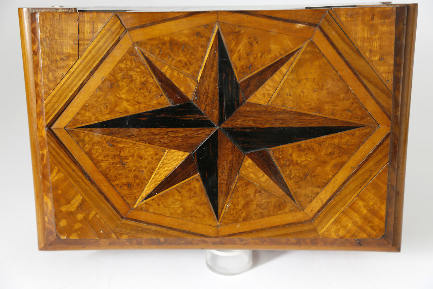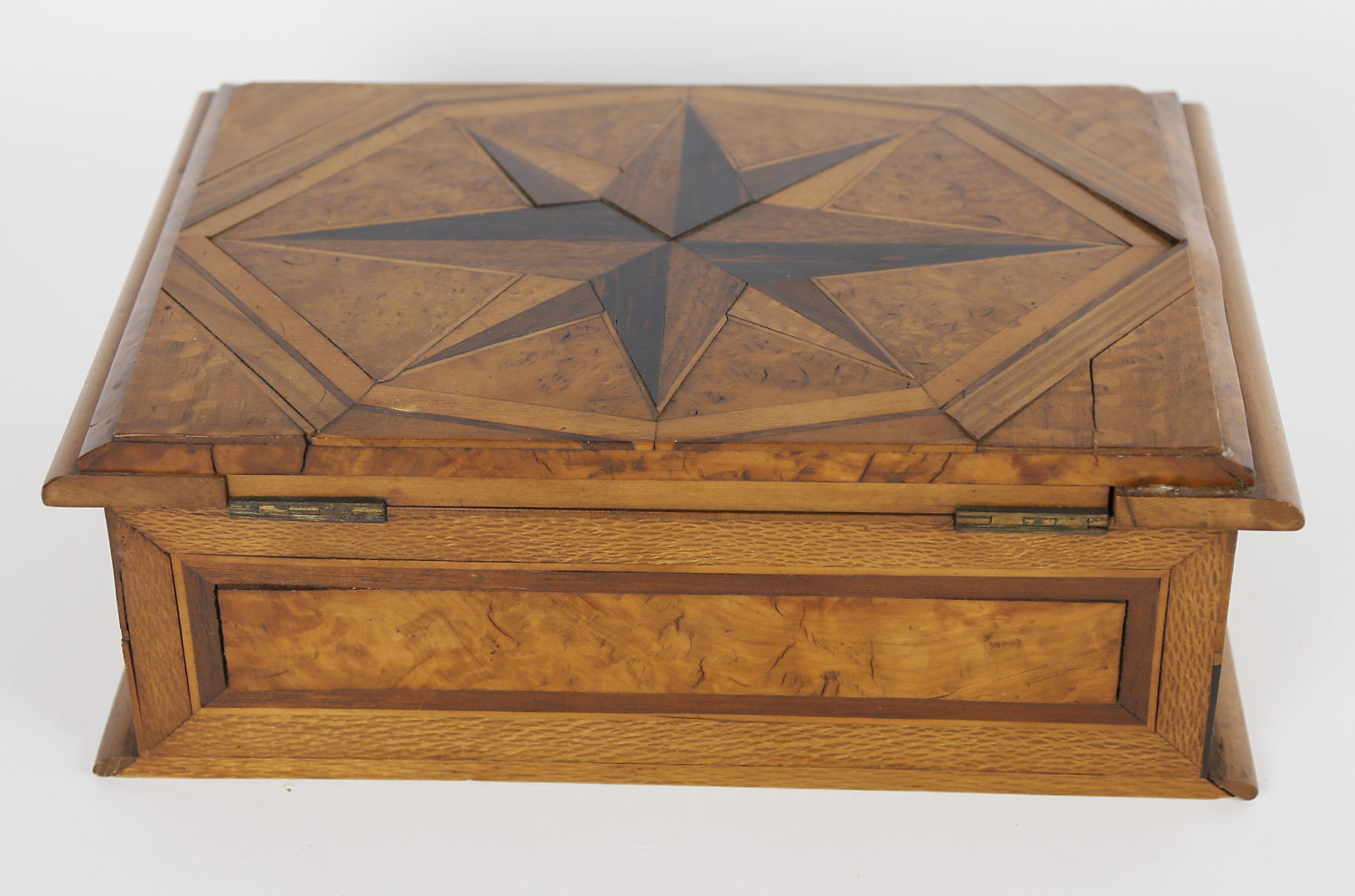 Whaler Made Star Inlaid Wood Specimen Box, circa 1860, rectangular step down molded hinged top on a conforming box with extended molded base; the top, front and two sides inlaid with approximately 233 pieces of rare and exotic wood from around the world. Examples of rosewood, burlwood, ebony, satinwood, mahogany, cherry, poplar and zebra woods