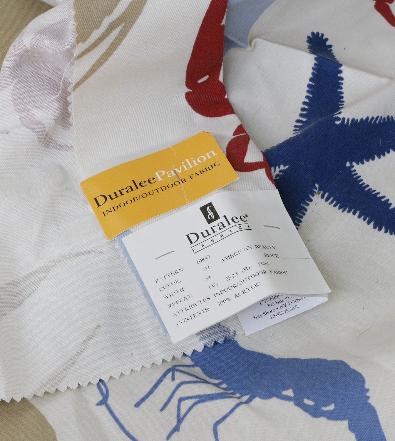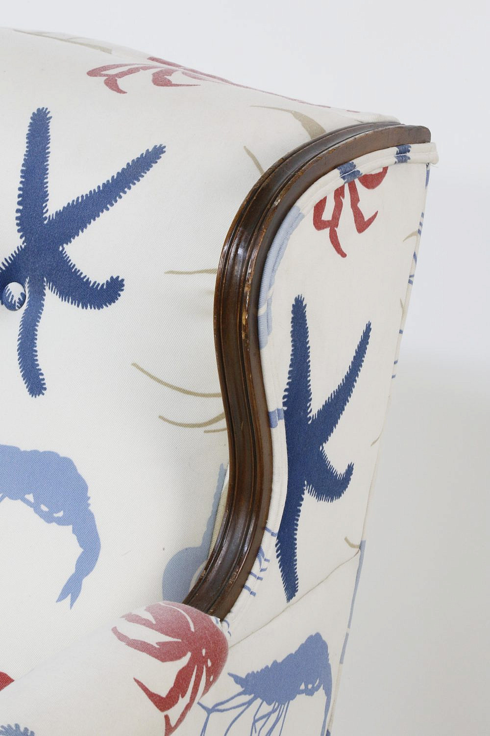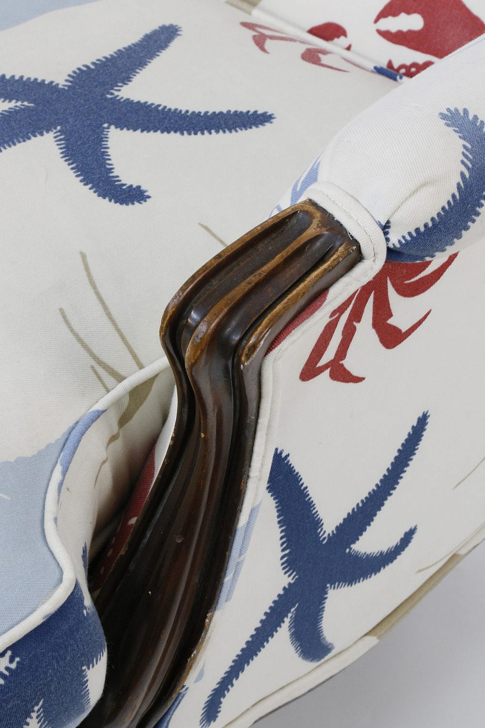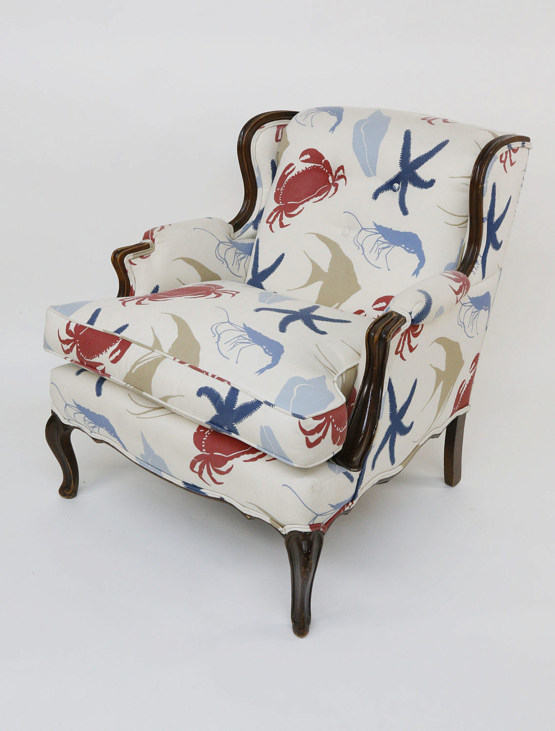 Duralee Pavilion Upholstered Club Chair Consign Now DeptFurniture/Decorative ArtsSizeHeight 34 in. Width 27 in. Depth 30 in. Duralee Pavilion Upholstered Club Chair, in a red white and blue sea life fabric, with starfish, crabs, shells, shrimp, and angelfish, walnut frame. Height 34 in. Width 27 in. Depth 30 in. Please note that this auction has ended. Click here for an overview of this auction.