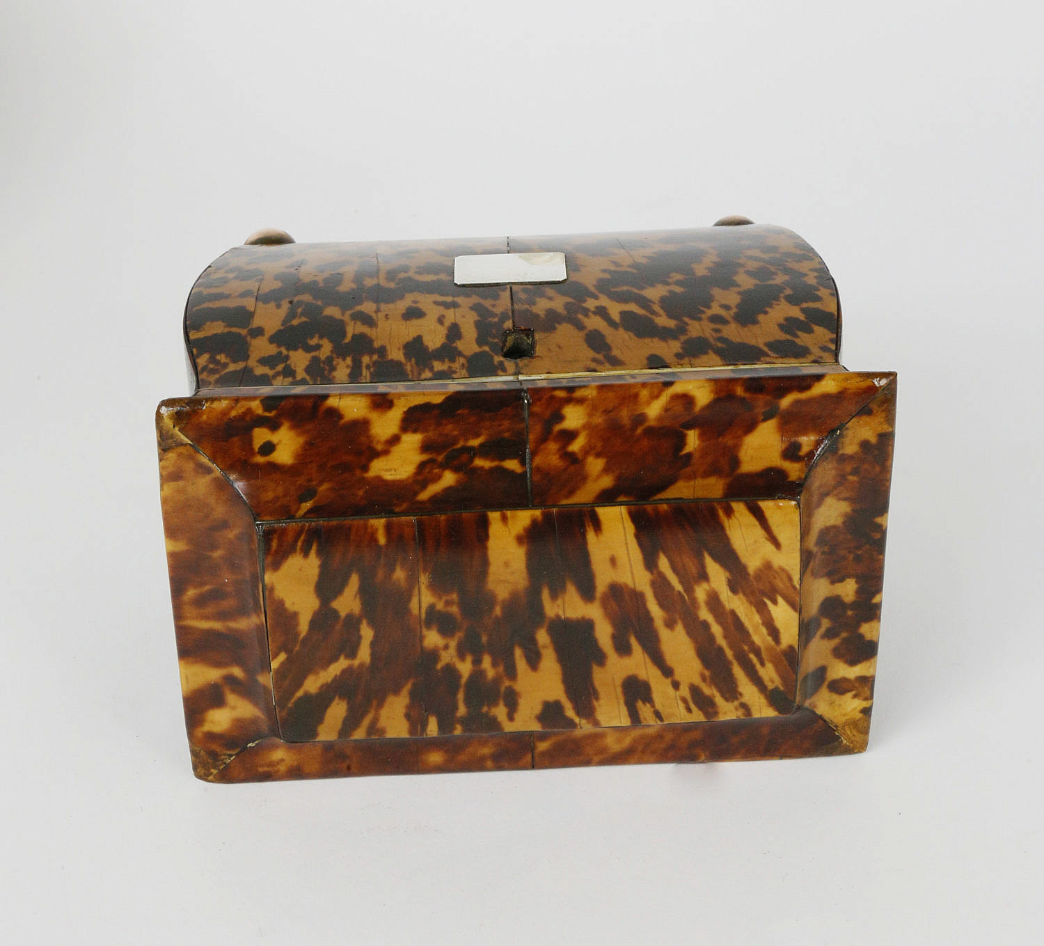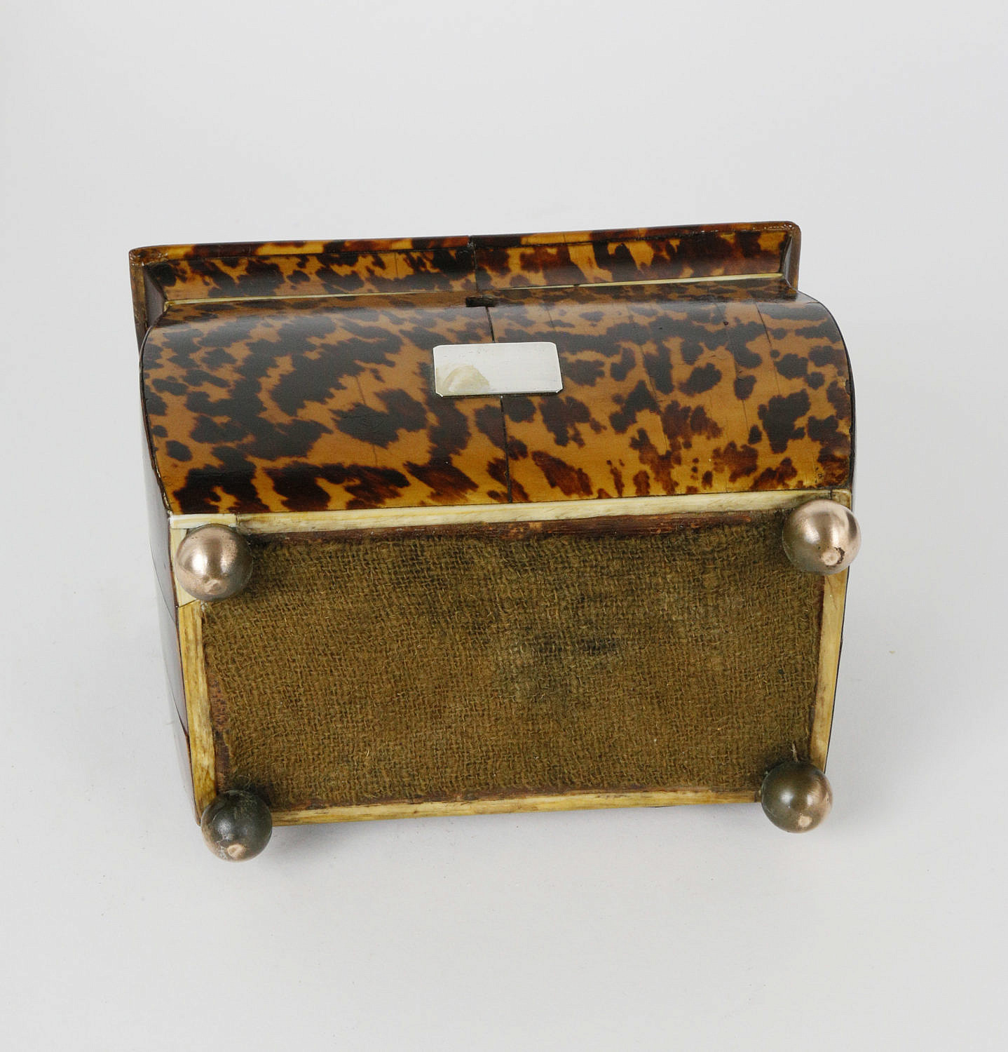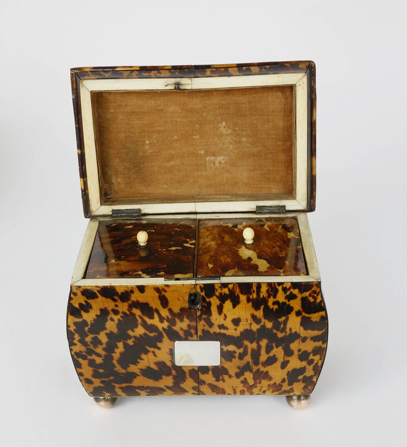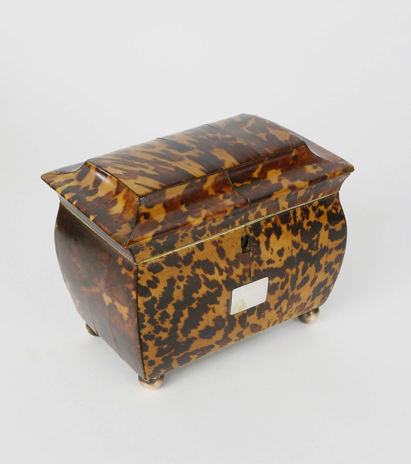 English Regency Tortoiseshell Double Compartment Tea Caddy, 19th c. Consign Now DeptCollections, Furniture/Decorative ArtsSizeHeight 5.5 in. Width 7 in. Depth 4.5 in. English Regency Tortoiseshell Double Compartment Tea Caddy, 19th Century, with pagoda shaped top, blank sterling silver nameplate, on ball feet. Height 5.5 in. Width 7 in. Depth 4.5 in. Please note that this auction has ended. Click here for an overview of this auction.