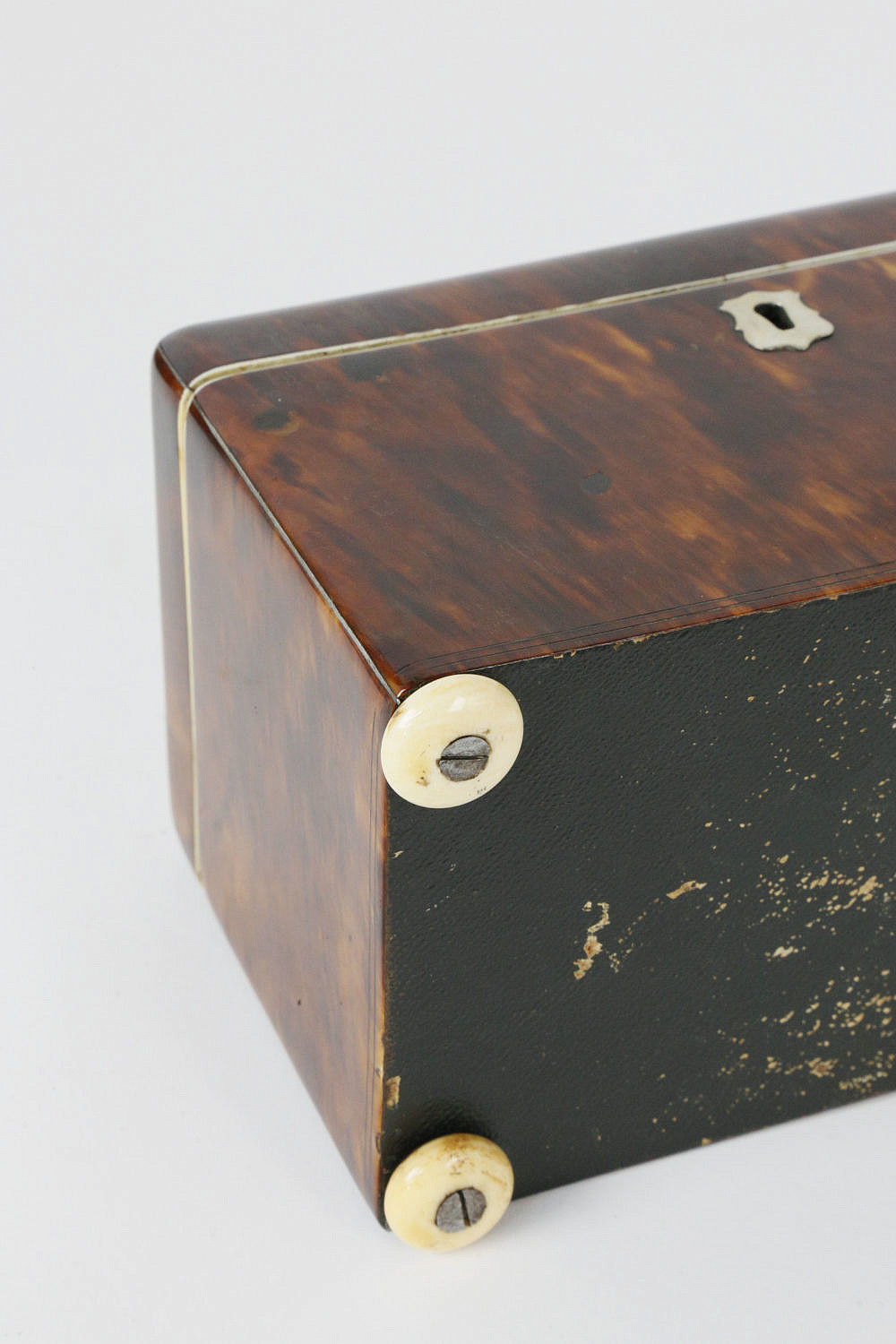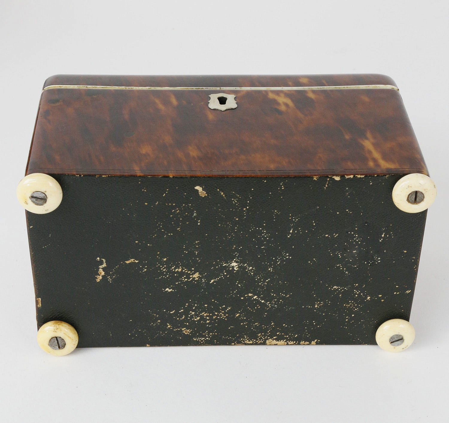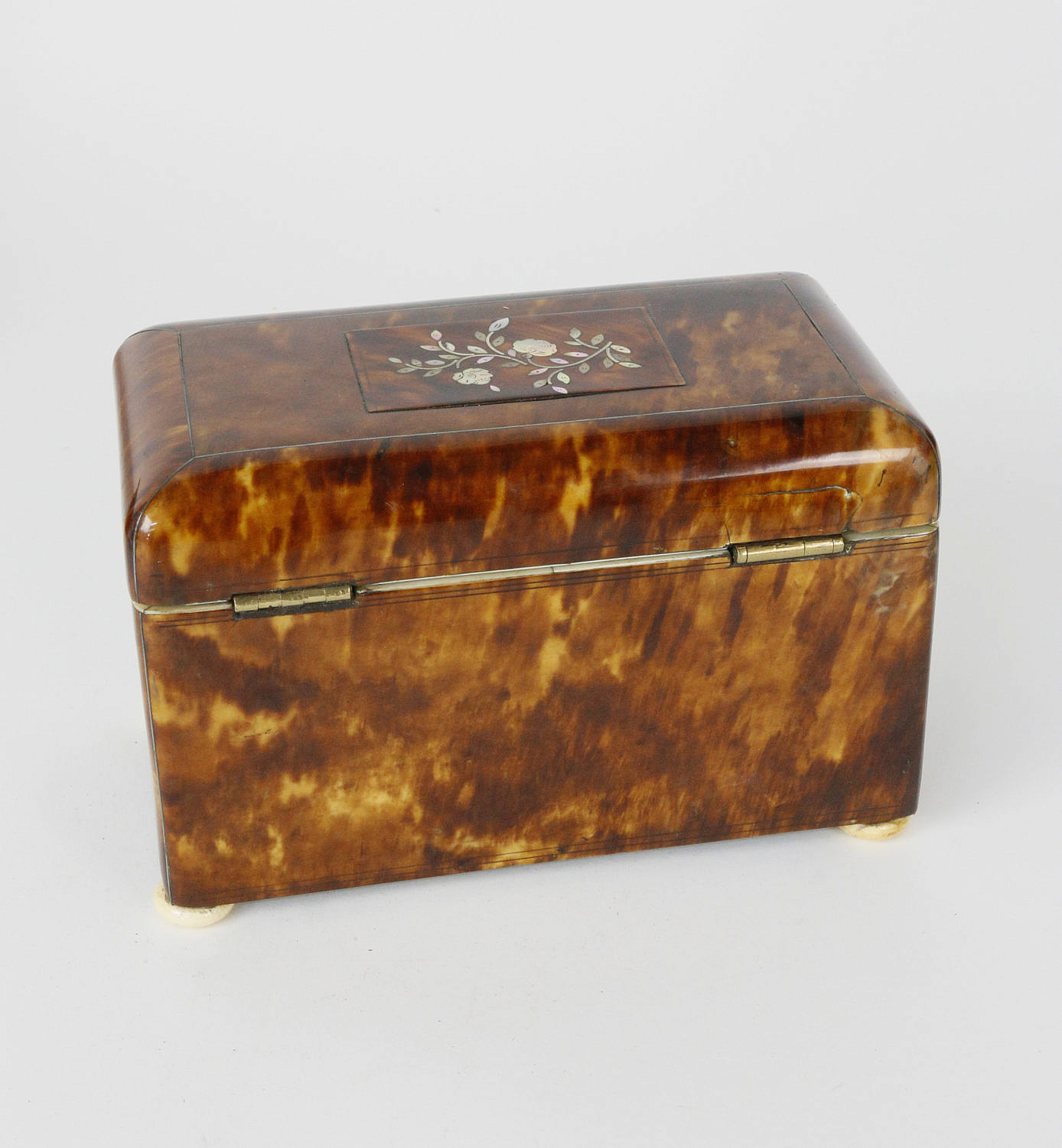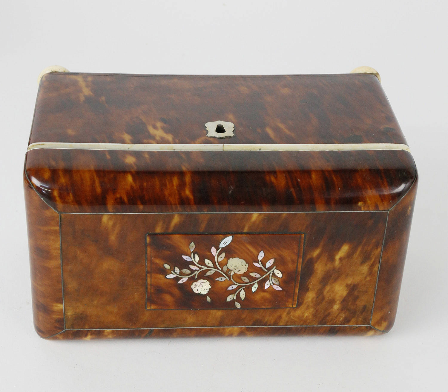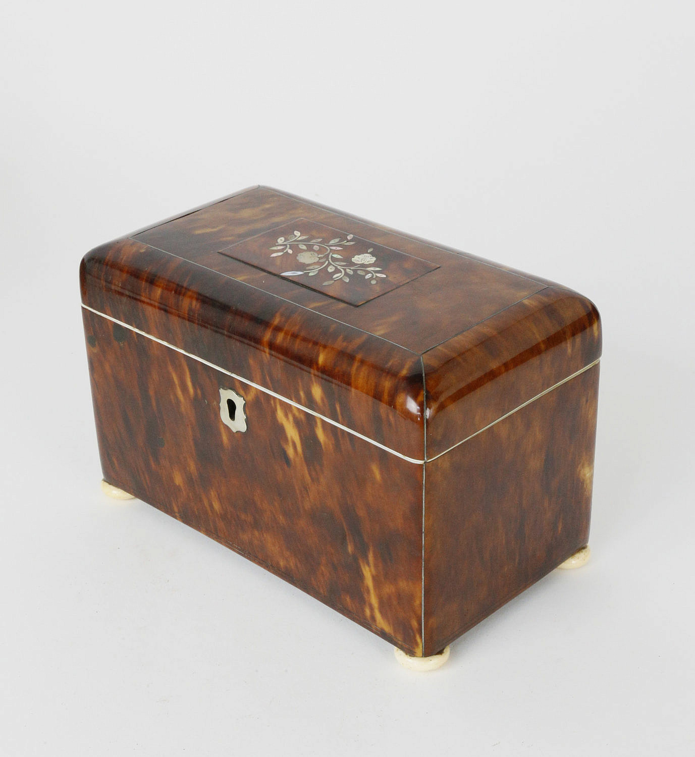 English Regency Tortoiseshell Double Compartment Tea Caddy, early 19th c. Consign Now DeptCollections, Furniture/Decorative ArtsSizeHeight 5 in. Width 7.5 in. Depth 4 in. Early 19th Century English Regency Tortoiseshell Double Compartment Tea Caddy, with mother of pearl floral inlaid lid, sterling silver escutcheon, on bun feet. Height 5 in. Width 7.5 in. Depth 4 in. Please note that this auction has ended. Click here for an overview of this auction.