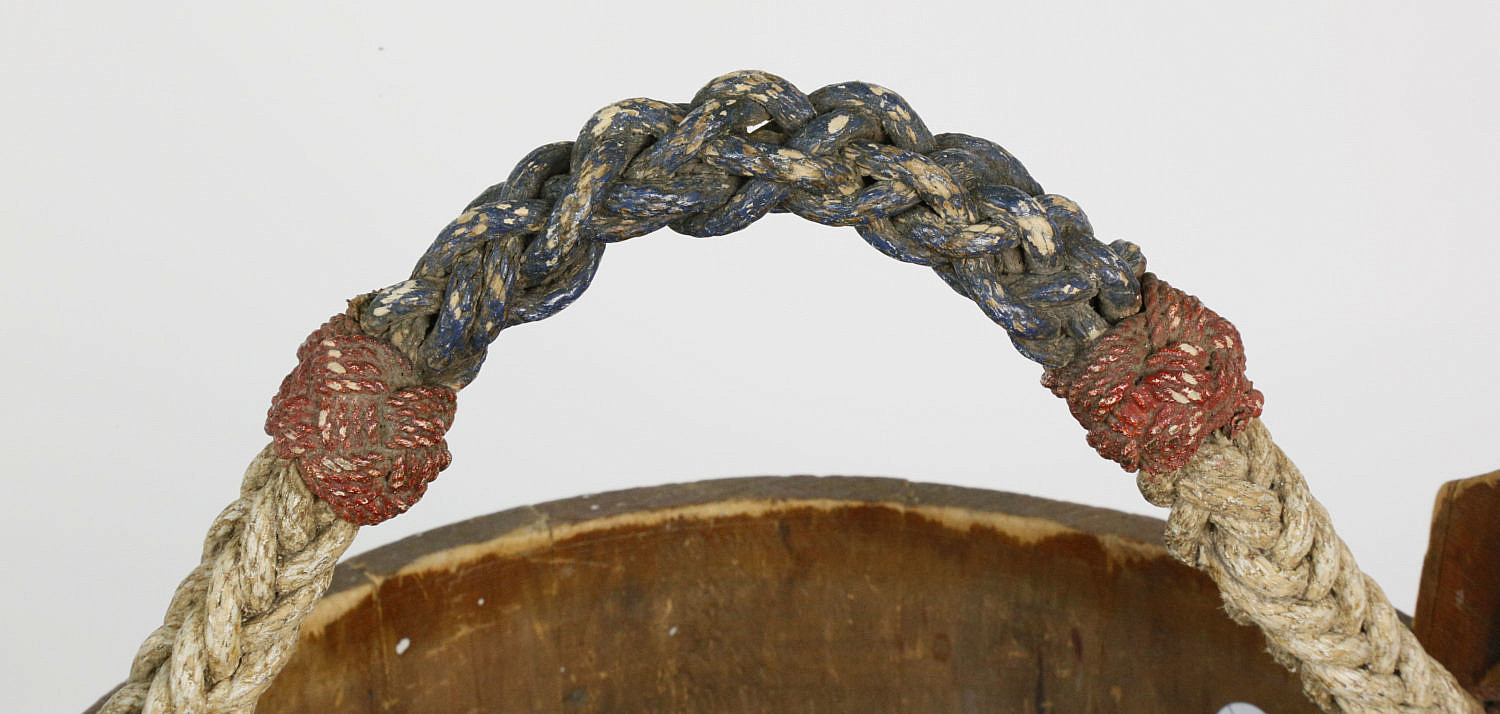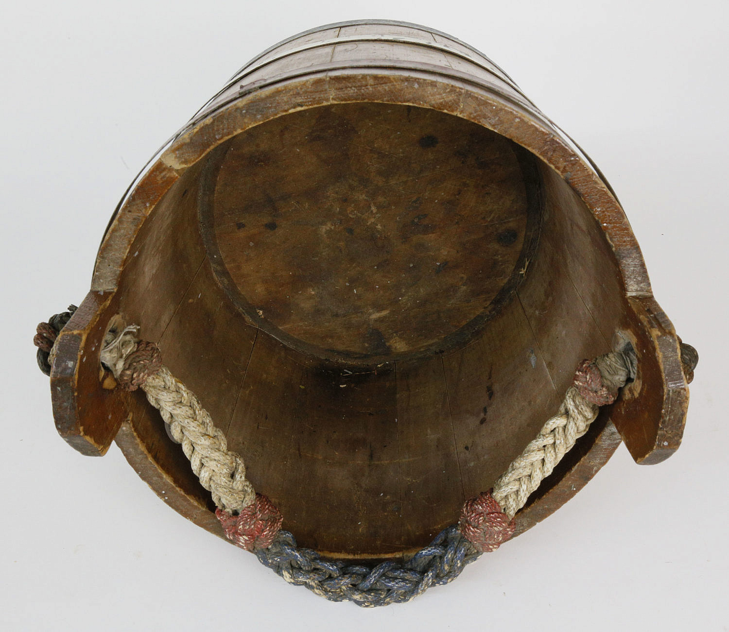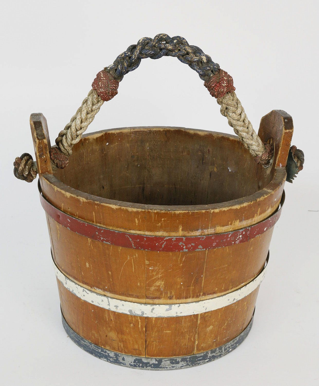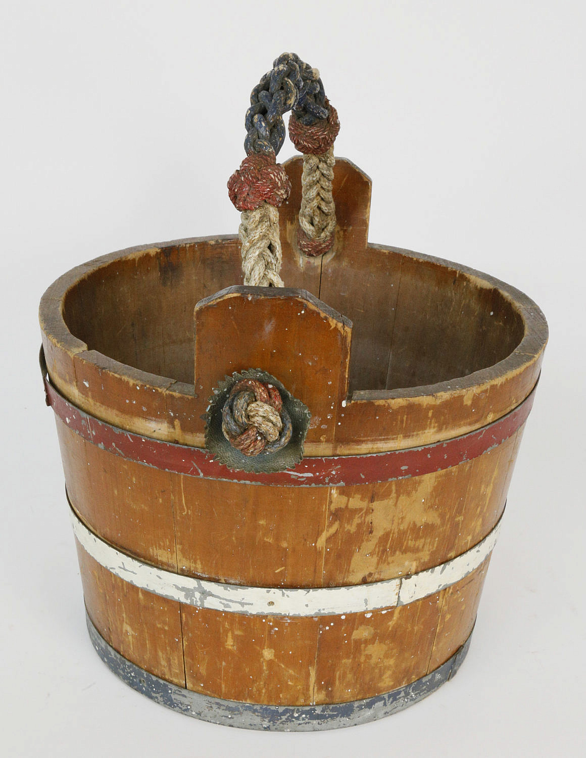Ships Water Bucket with Polychromed Fancy Ropework Becket Handle Consign Now DeptAmericana and Folk Arts, Maritime Arts, Nantucket ArtSizeHeight 11 in. Width 14 in. Depth 12 in. Ships Water Bucket with Polychromed Fancy Ropework Becket Handle, 19th Century, red, white, and blue strapping. Height 11 in. Width 14 in. Depth 12 in. Please note that this auction has ended. Click here for an overview of this auction.