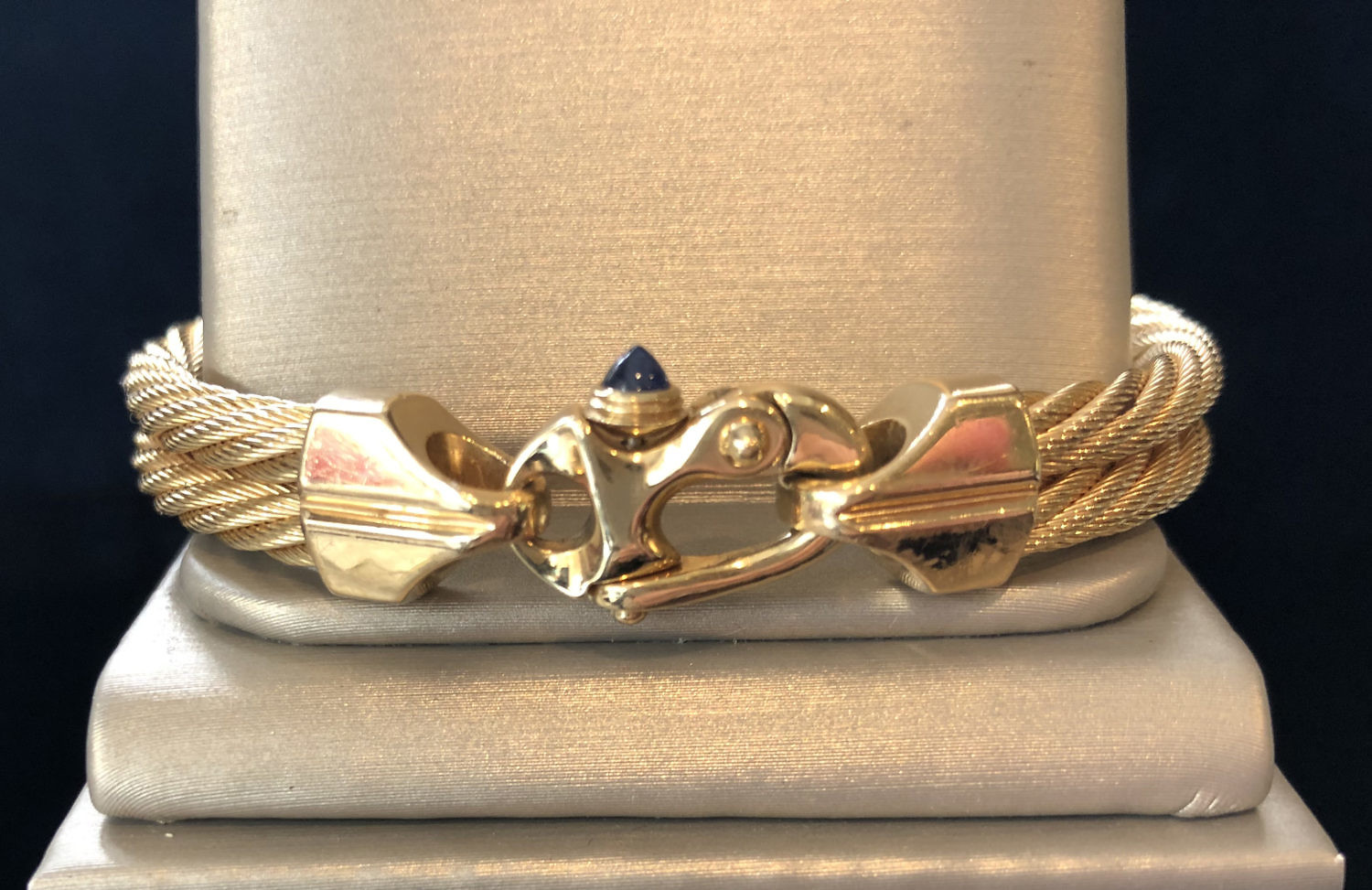 14k Yellow Gold Guy Beard Custom Designed Nautical Form Twisted Double Cable Bracelet Consign Now DeptJewelrySizeApprox. 49 gm. 14k Yellow Gold Guy Beard Custom Designed Nautical Form Twisted Double Cable Bracelet, Set with Blue Sapphire on Clasp; Marked with Maker’s Initials “T.M.I. 14k” Approx. 49 gm. Please note that this auction has ended. Click here for an overview of this auction.