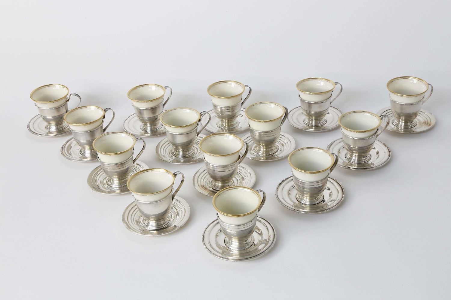 Assembled Set of 14 Sterling Silver and Porcelain Demi Tasse Cups and Saucers Consign Now DeptSilver Assembled Set of 14 Sterling Silver and Porcelain Demi Tasse Cups and Saucers, circa 1930, with Lenox German porcelain liners, 6 silver cups and saucers, 8 silver cups and saucers Please note that this auction has ended. Click here for an overview of this auction.